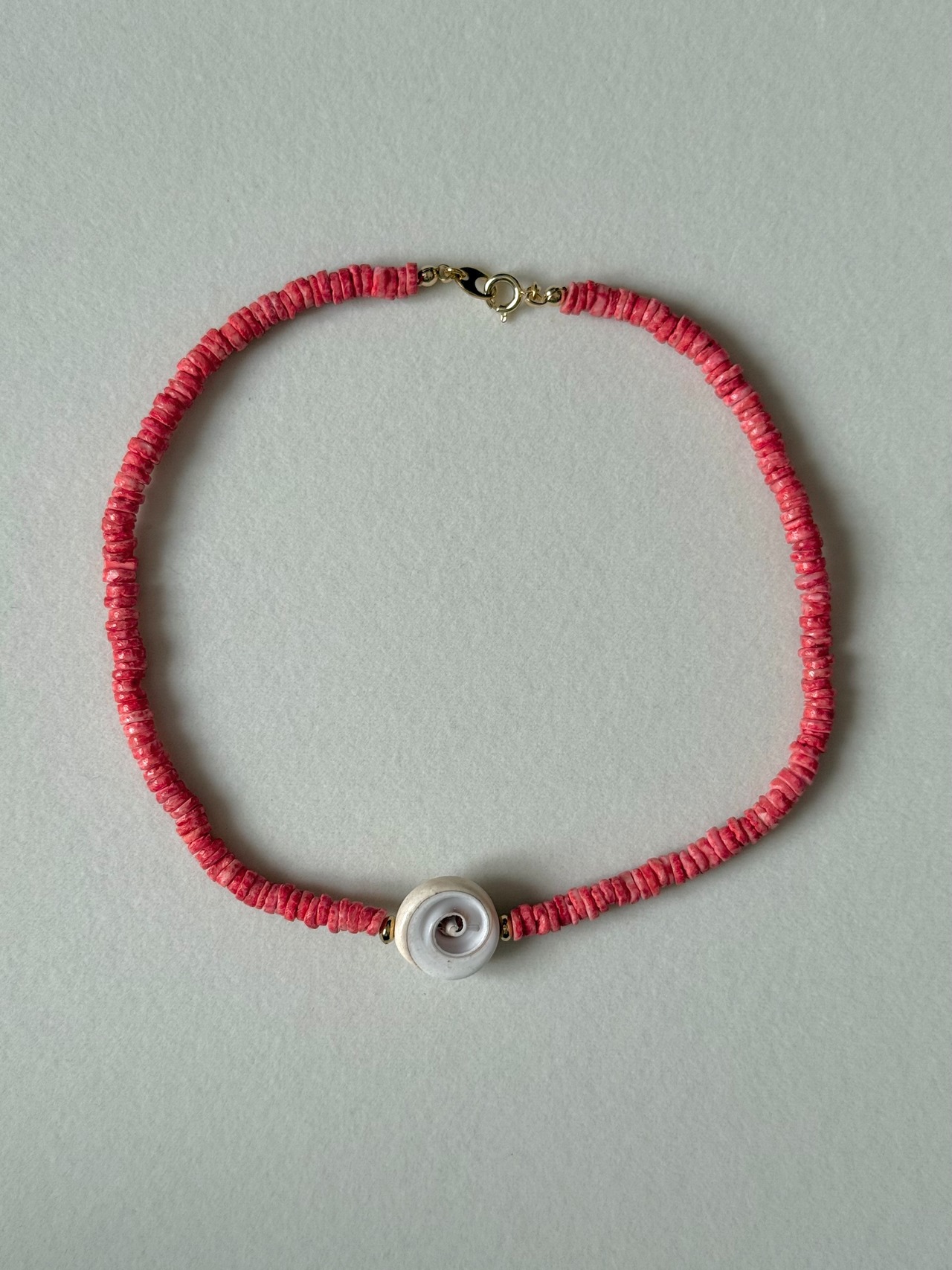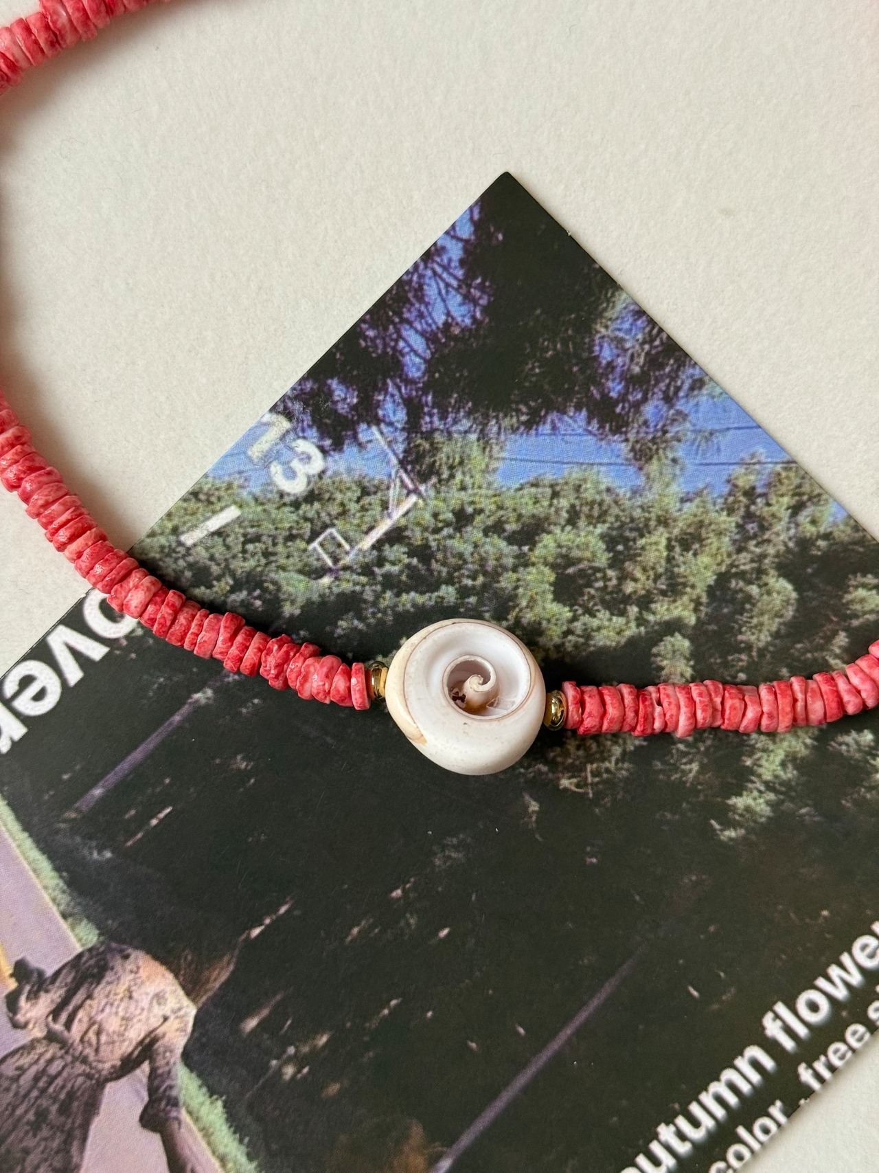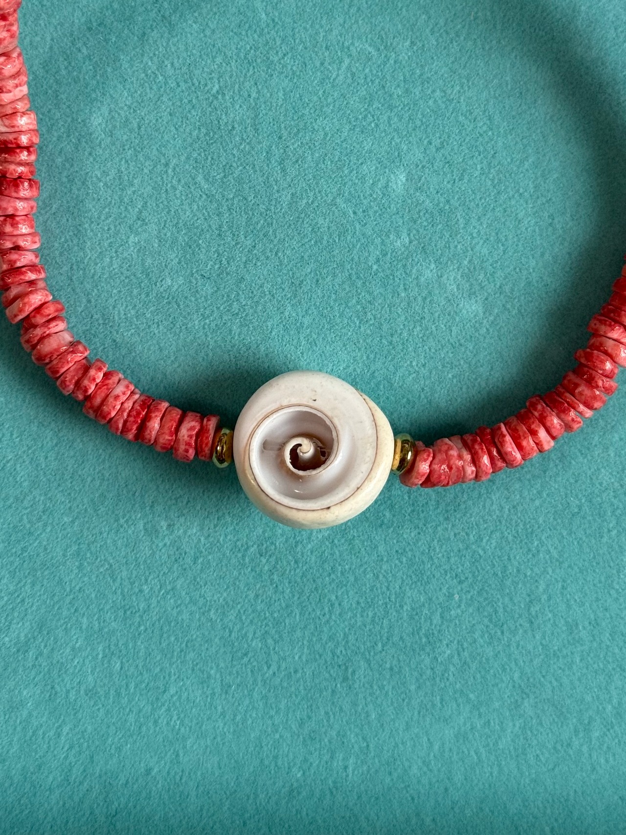 赤ベースのシェルビーズとぐるぐるシェルのシェル尽くしなチョーカーとなっております。