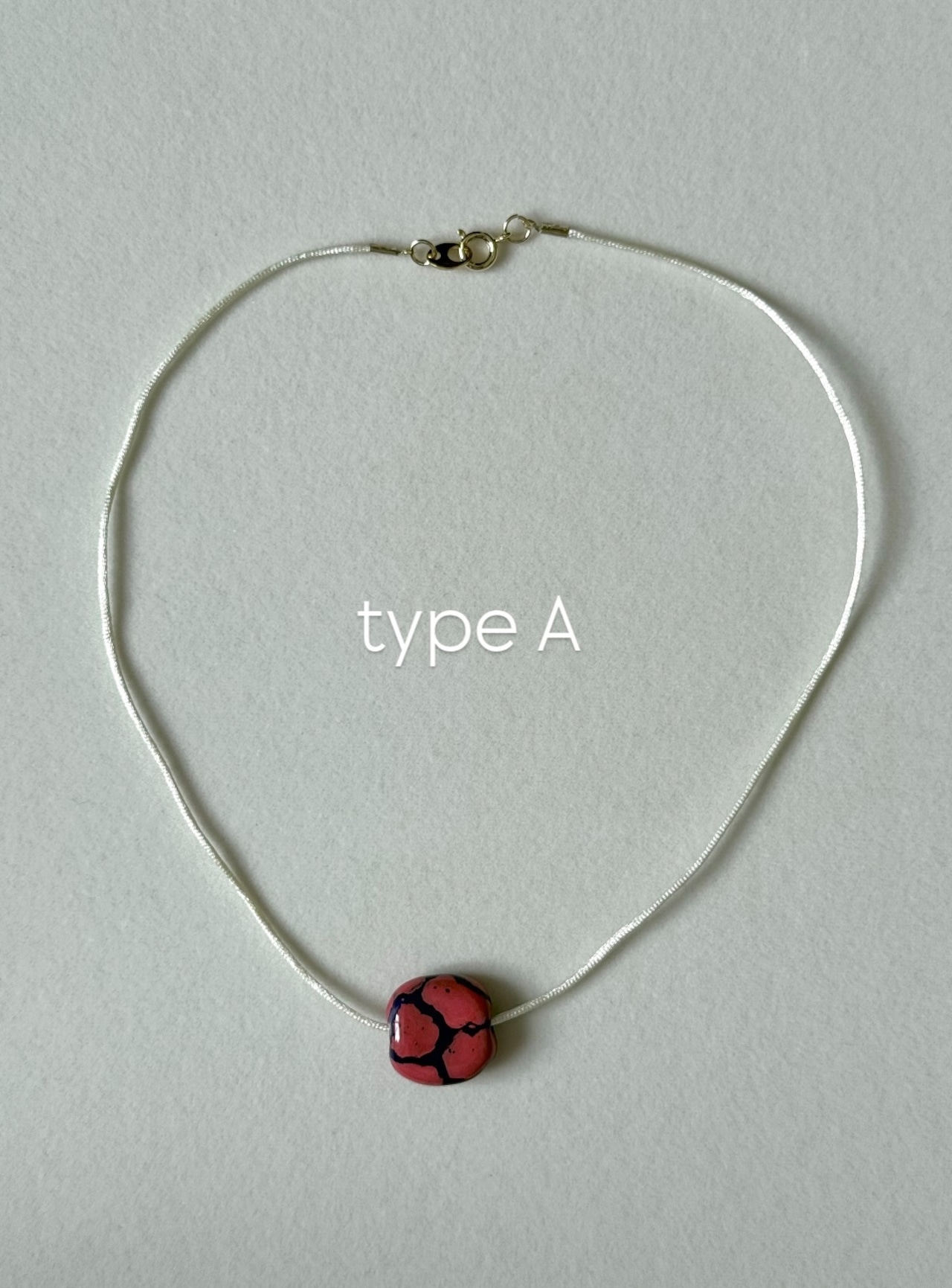 サテンコードにポイントで陶器でできた不思議な柄のビーズを組み合わせたネックレスとなっております。