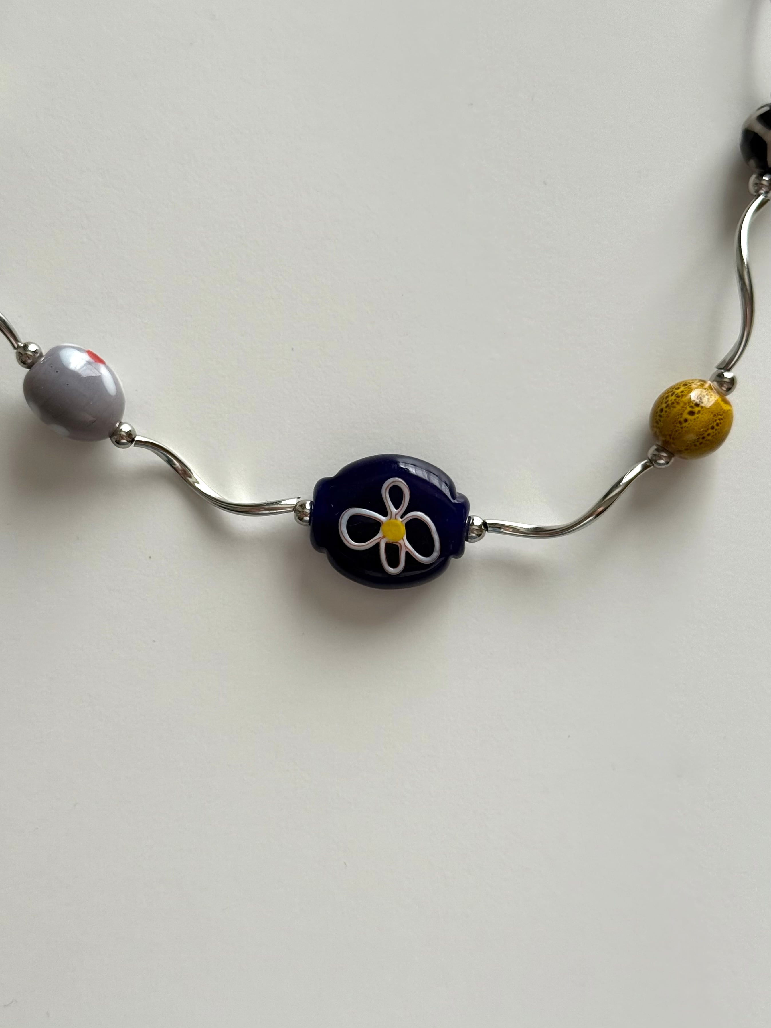 陶器やガラスでできたビーズとシルバーのウネウネを組み合わせたネックレスとなっております。