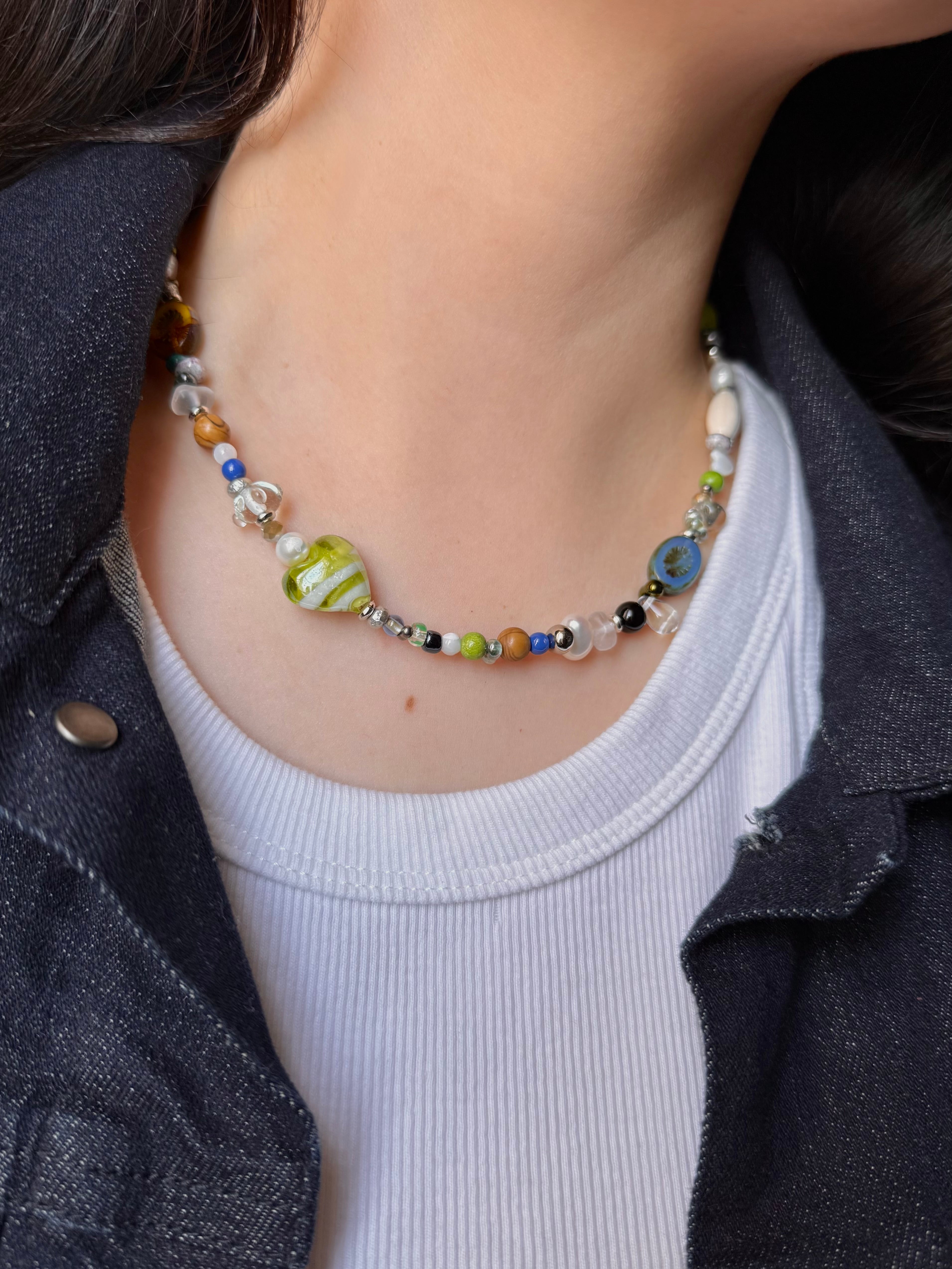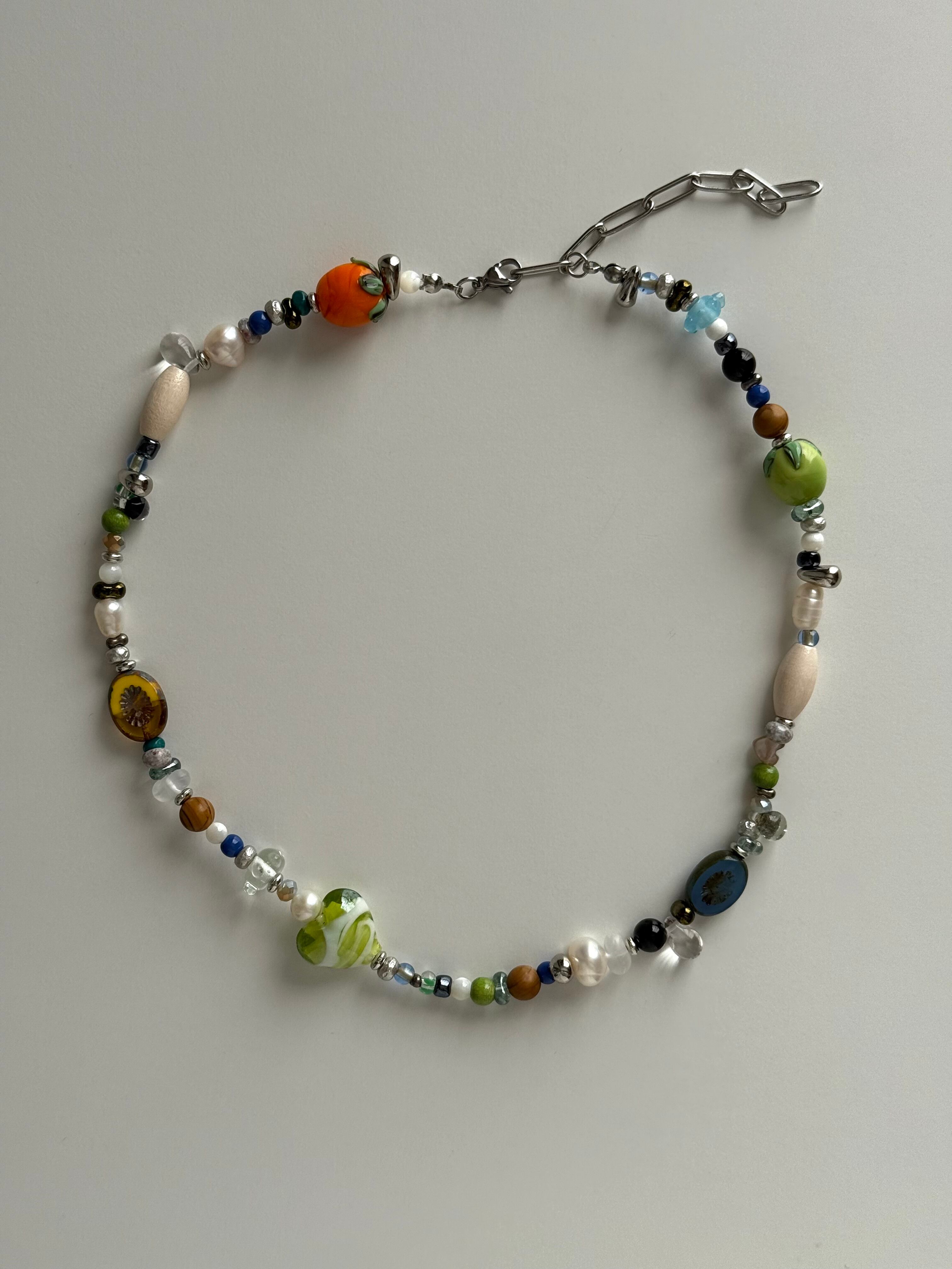 さまざまなビーズを組み合わせたネックレスとなっております。