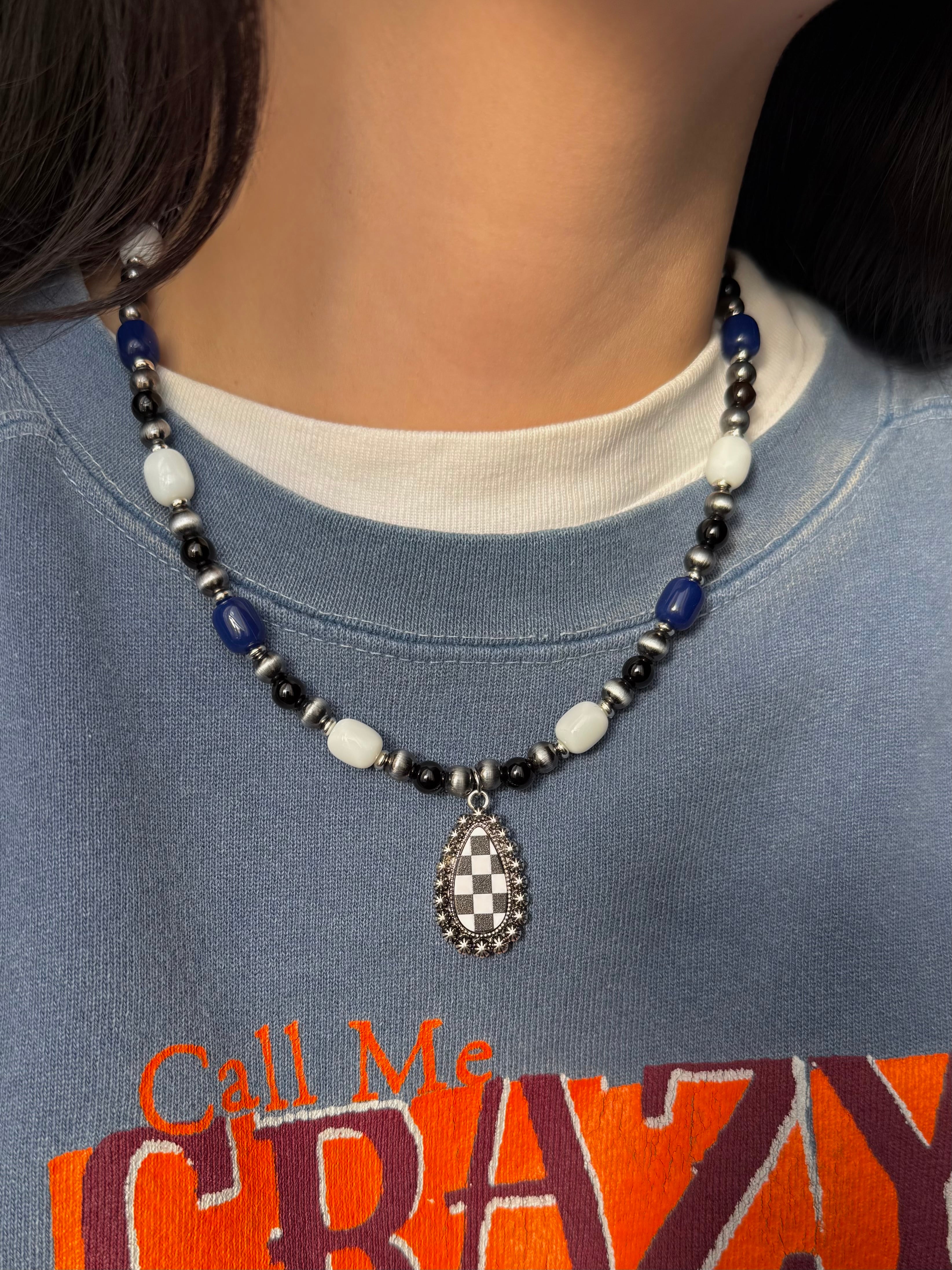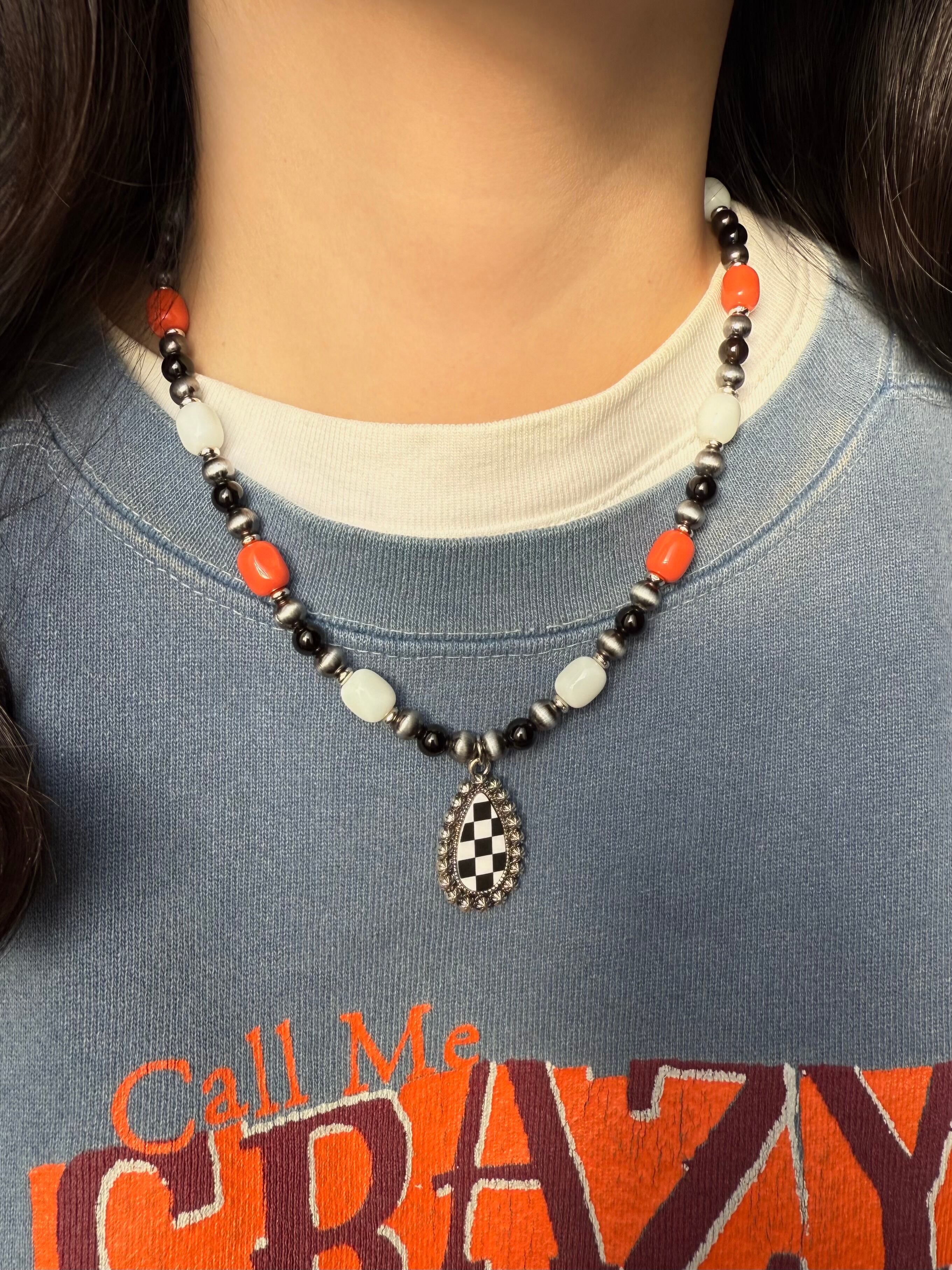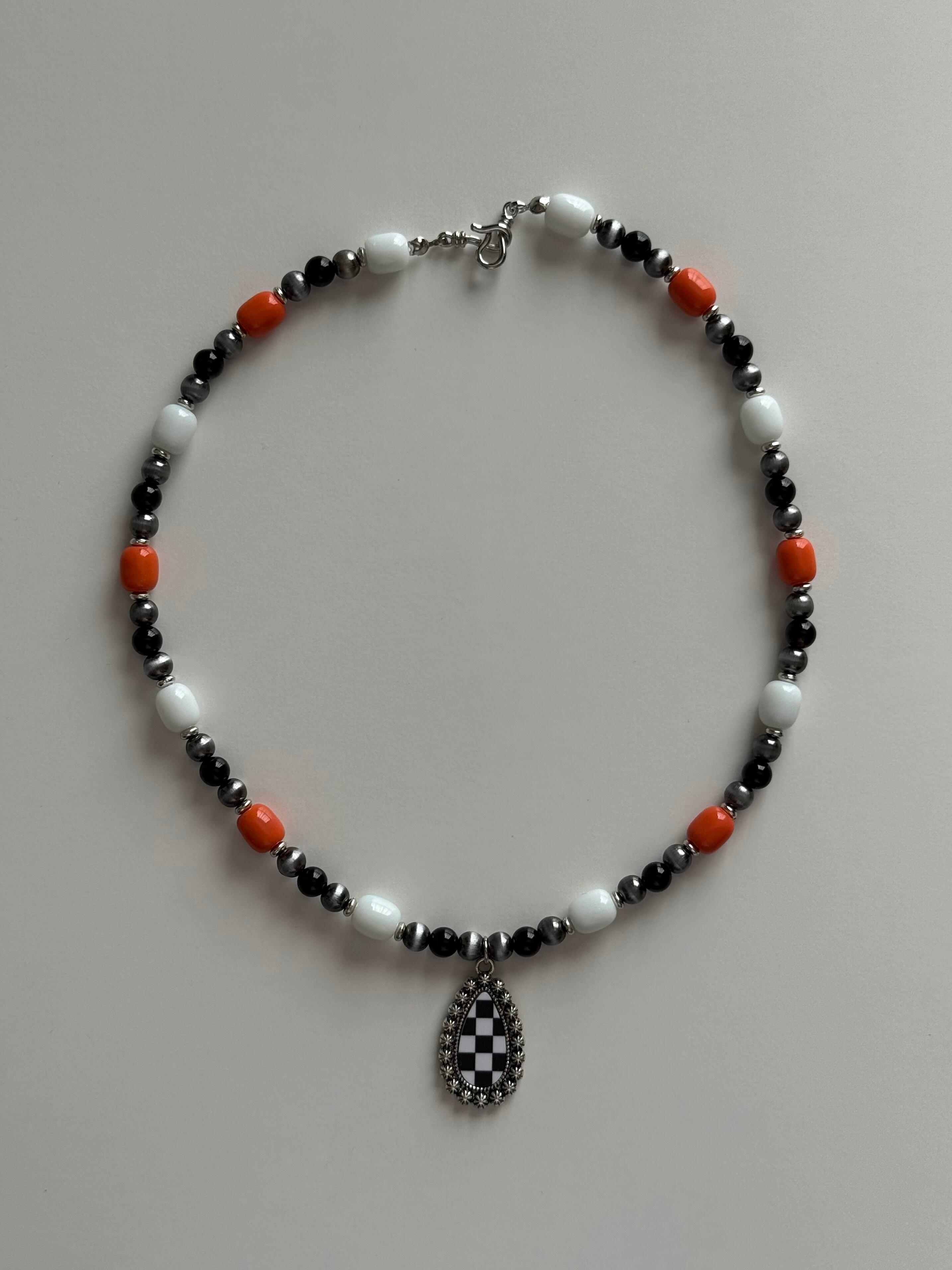 さまざまなビーズを組み合わせてvintage感のあるチャームをポイントとしたネックレスとなっております。