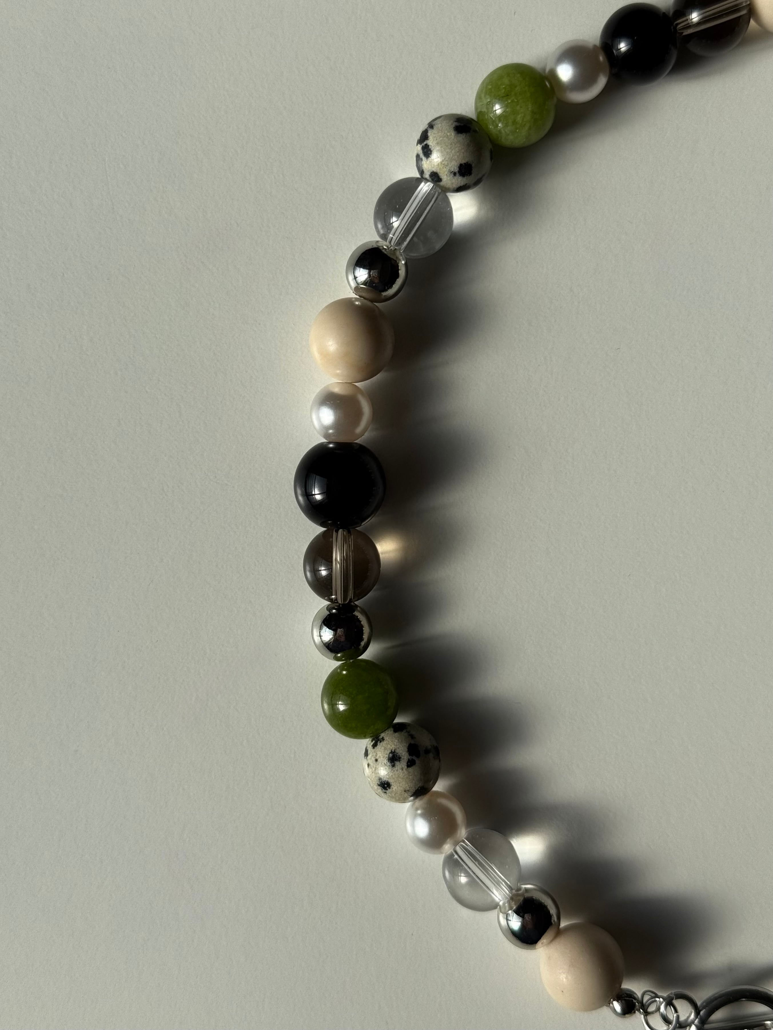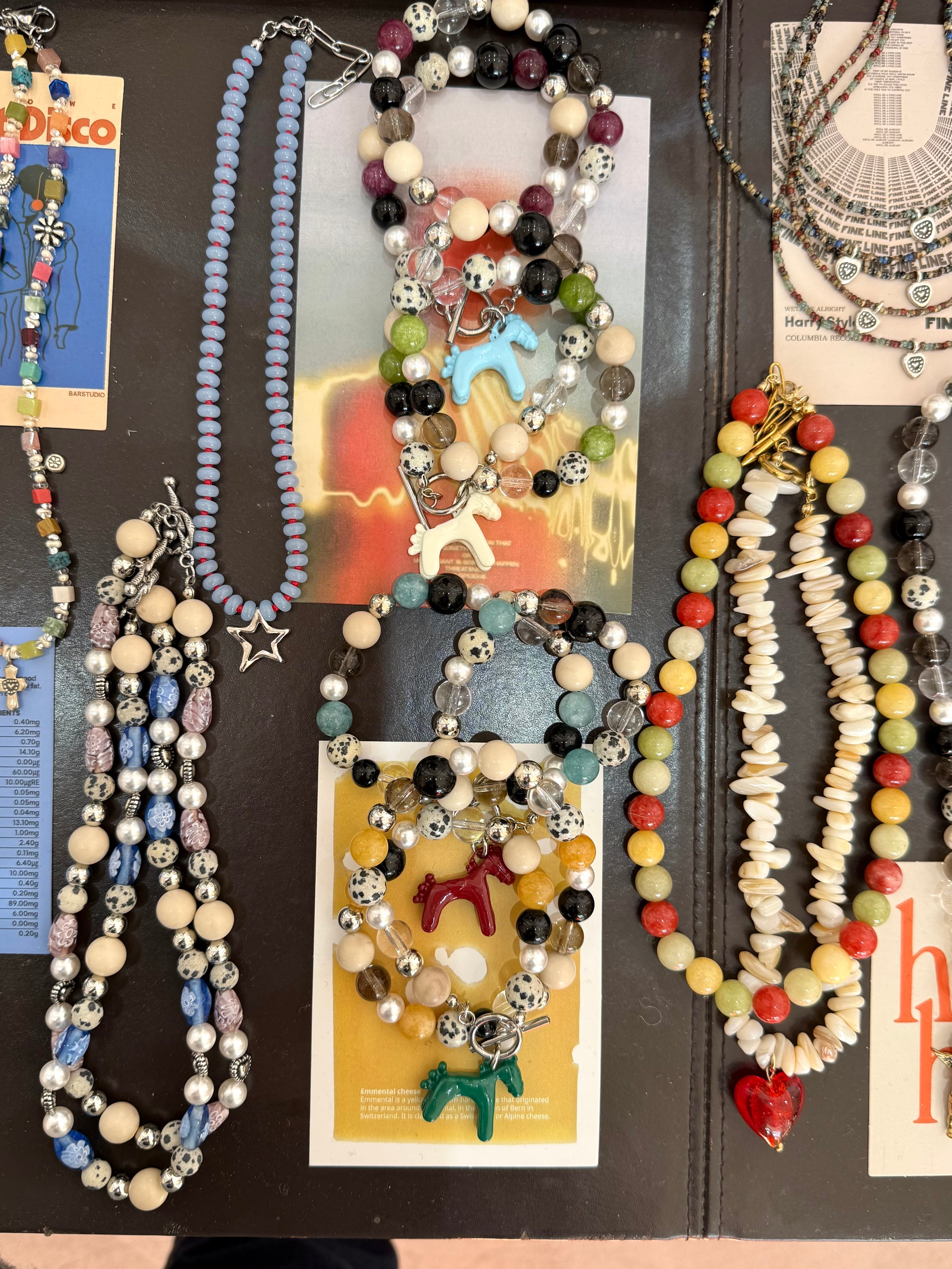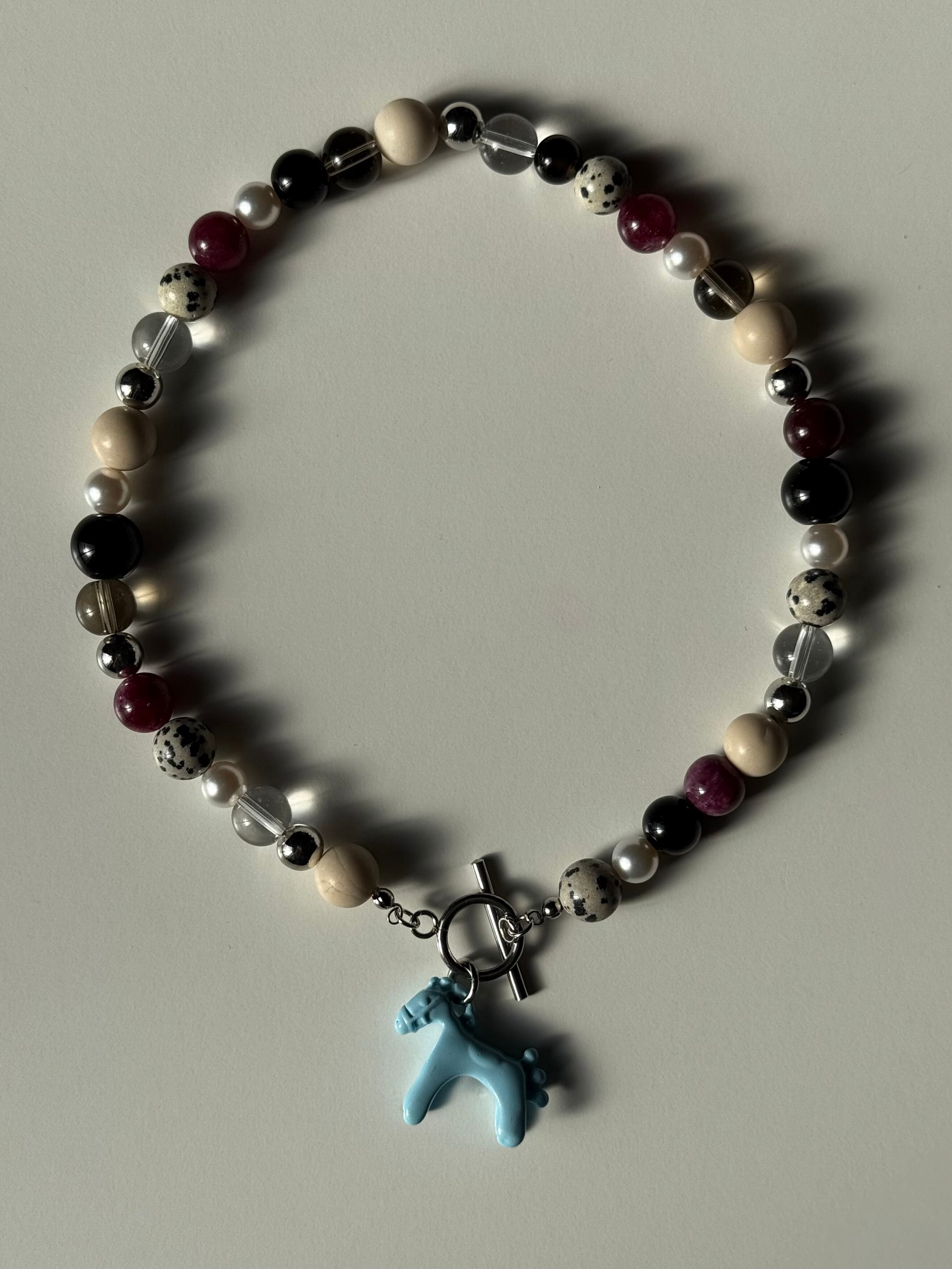 お馬ちゃんをメインにいろんな天然石を組み合わせたネックレスとなっております。