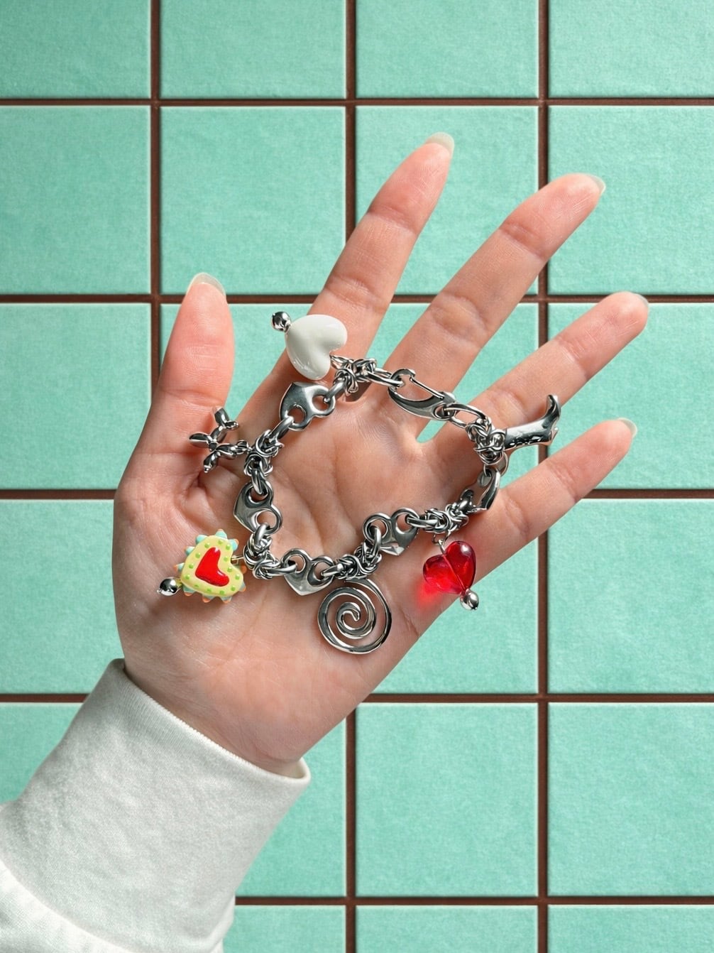 ハートチェーンにさまざま可愛すぎるチャームを組み合わせたブレスレットとなっております。