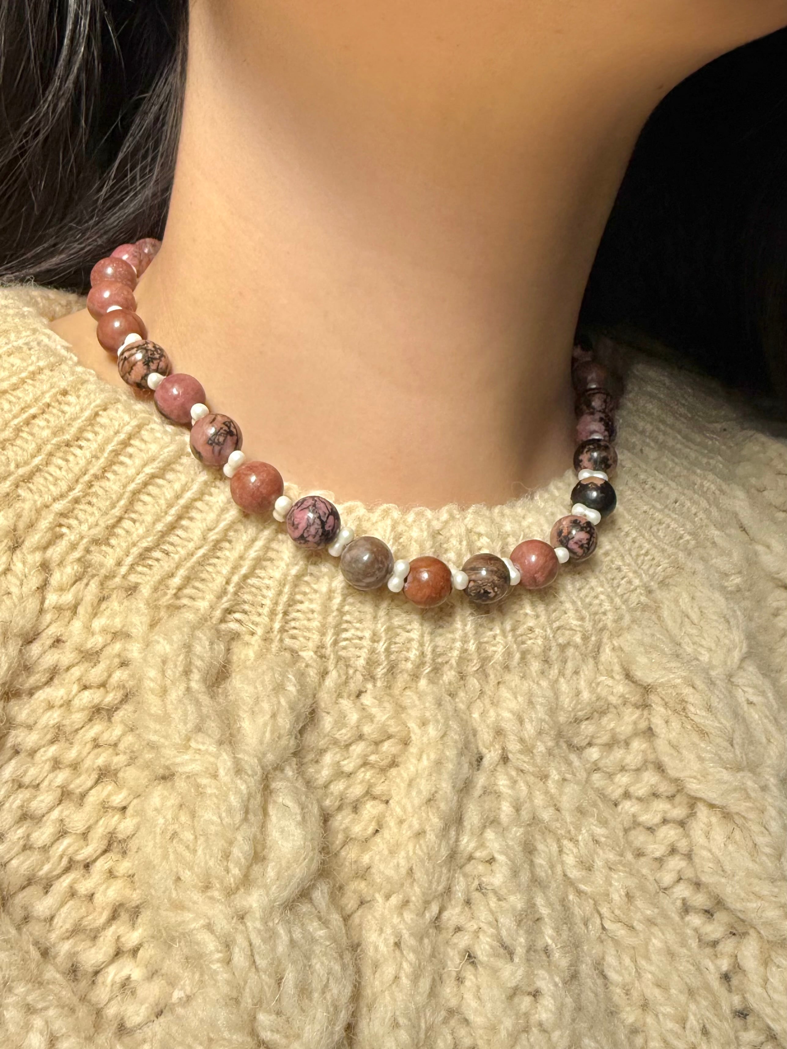 でかでかハートチャームとストロベリーチョコレートのような天然石を組み合わせたネックレスとなっております。