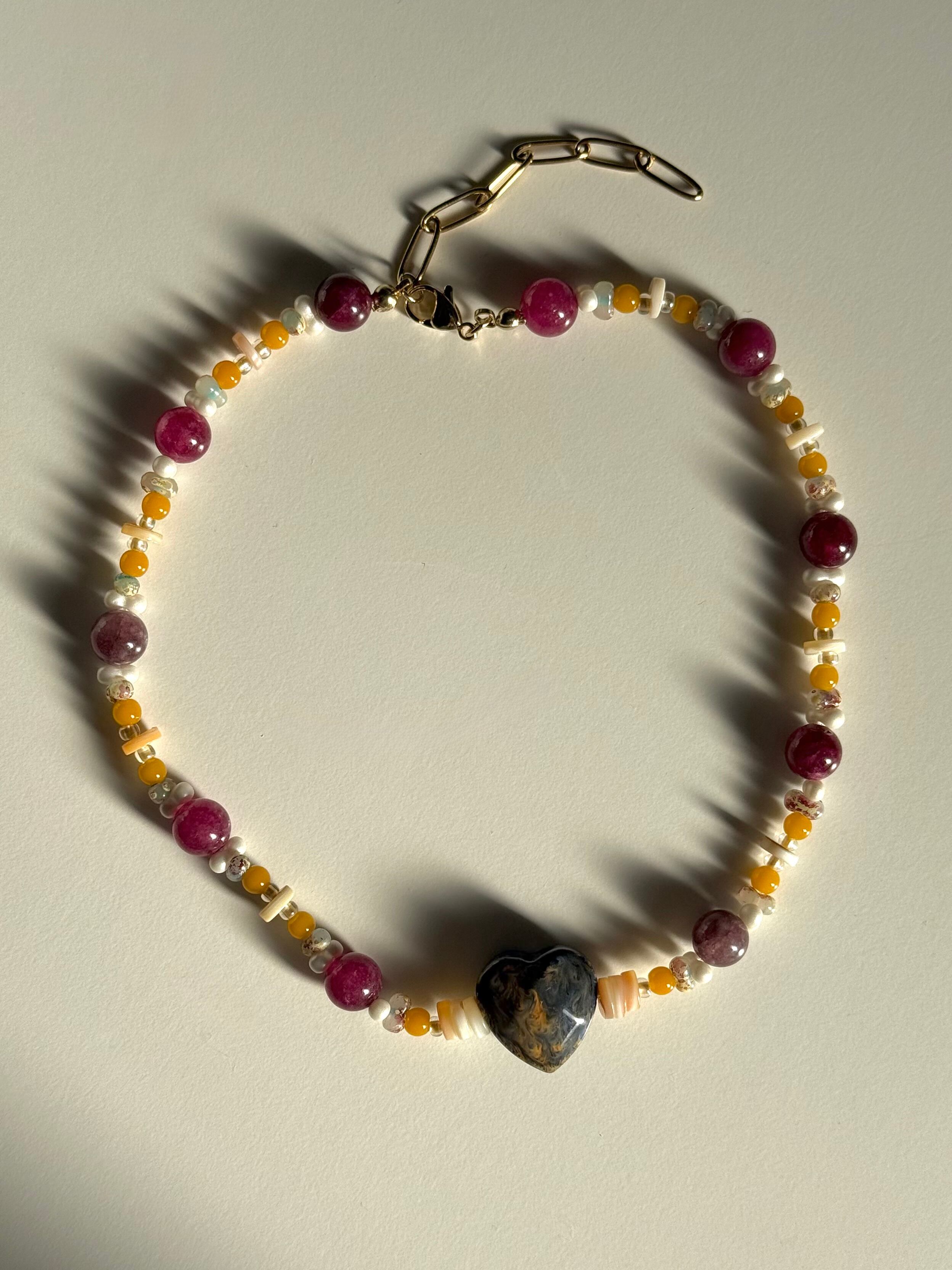 まるで絵画からポロッと生まれたようなハートをメインにさまざまなビーズを組み合わせたネックレスとなっております。