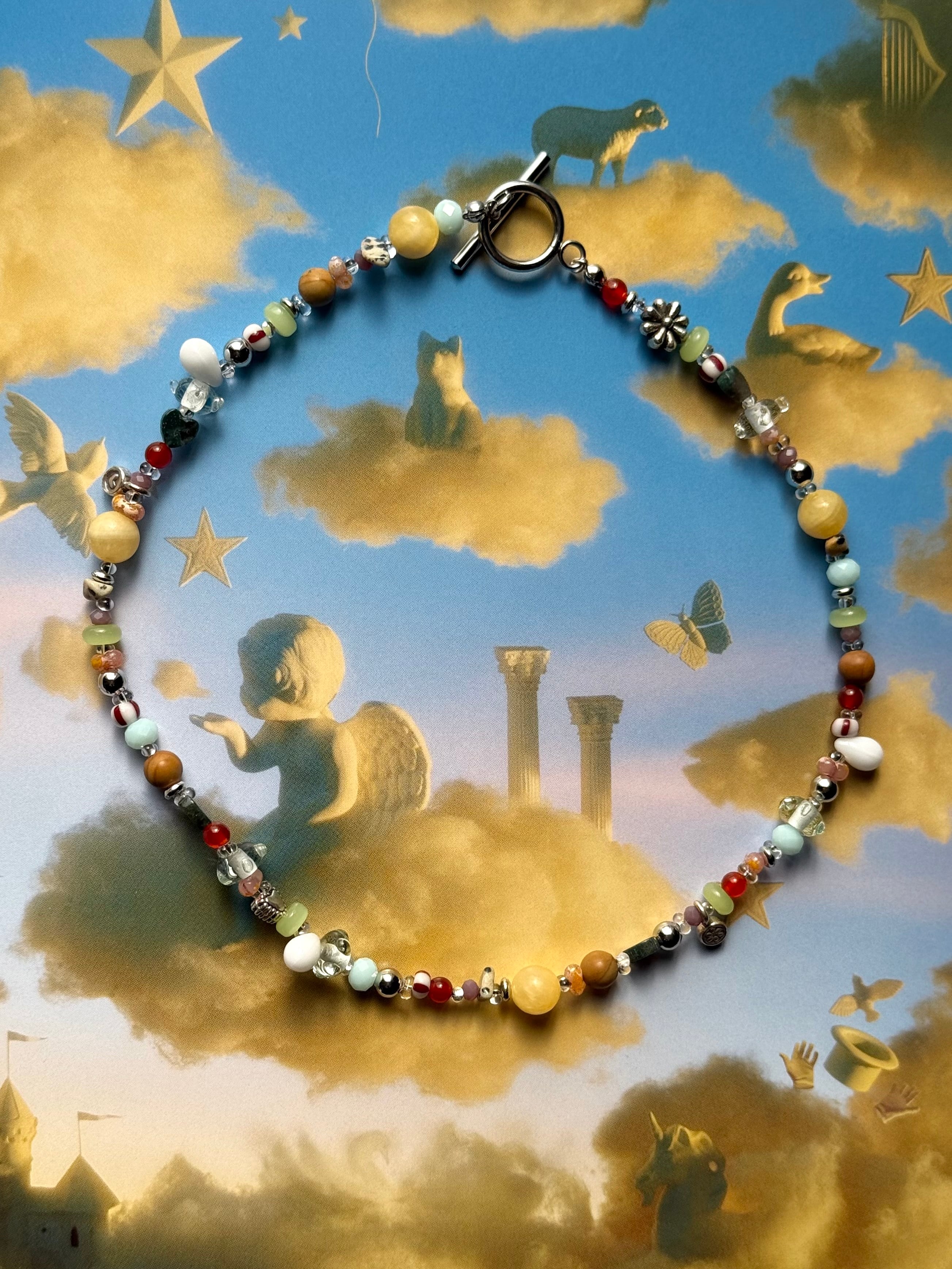 さまざまなガラスビーズや天然石、カレンシルバーなどを組み合わせたネックレスとなっております。