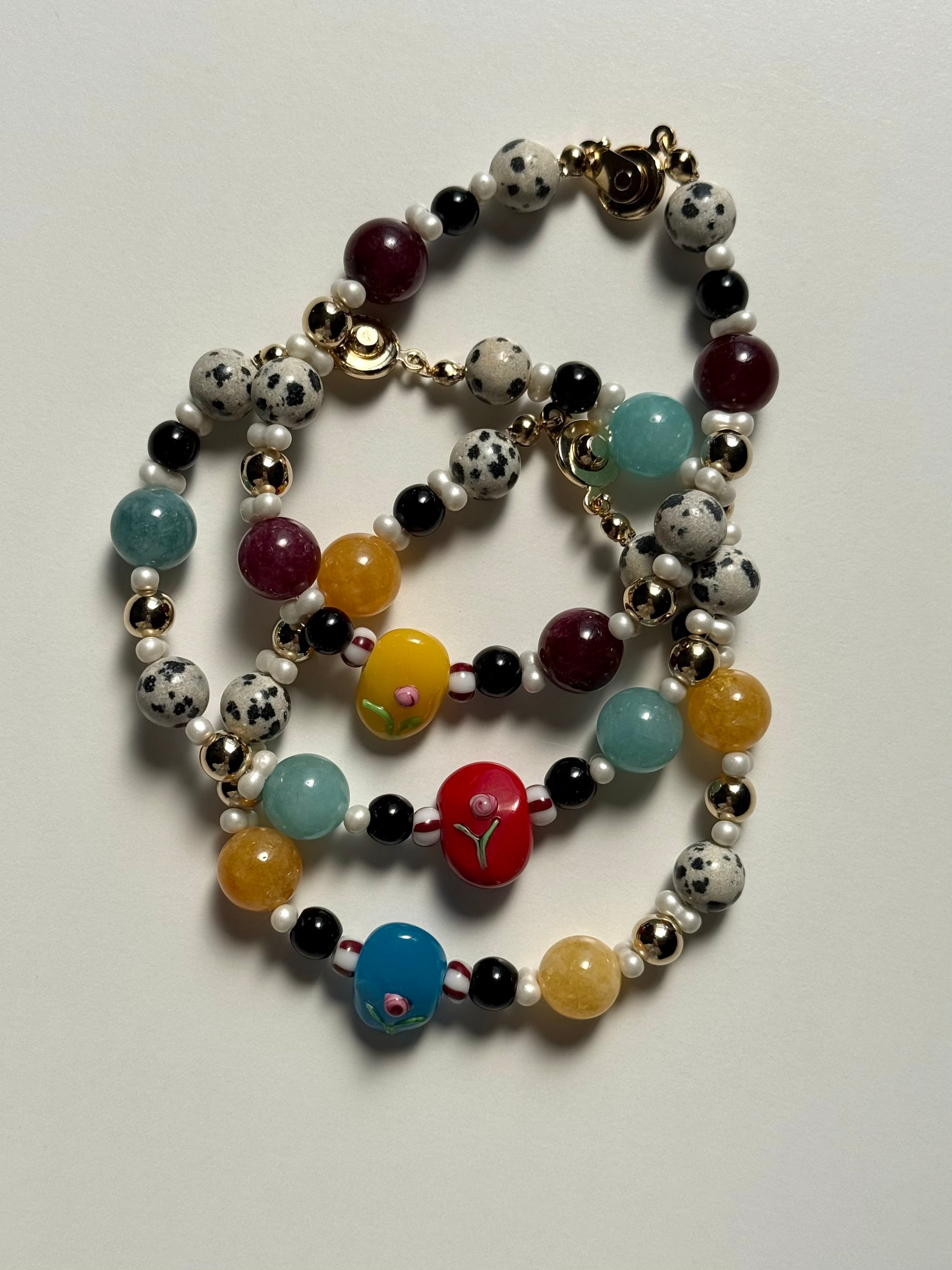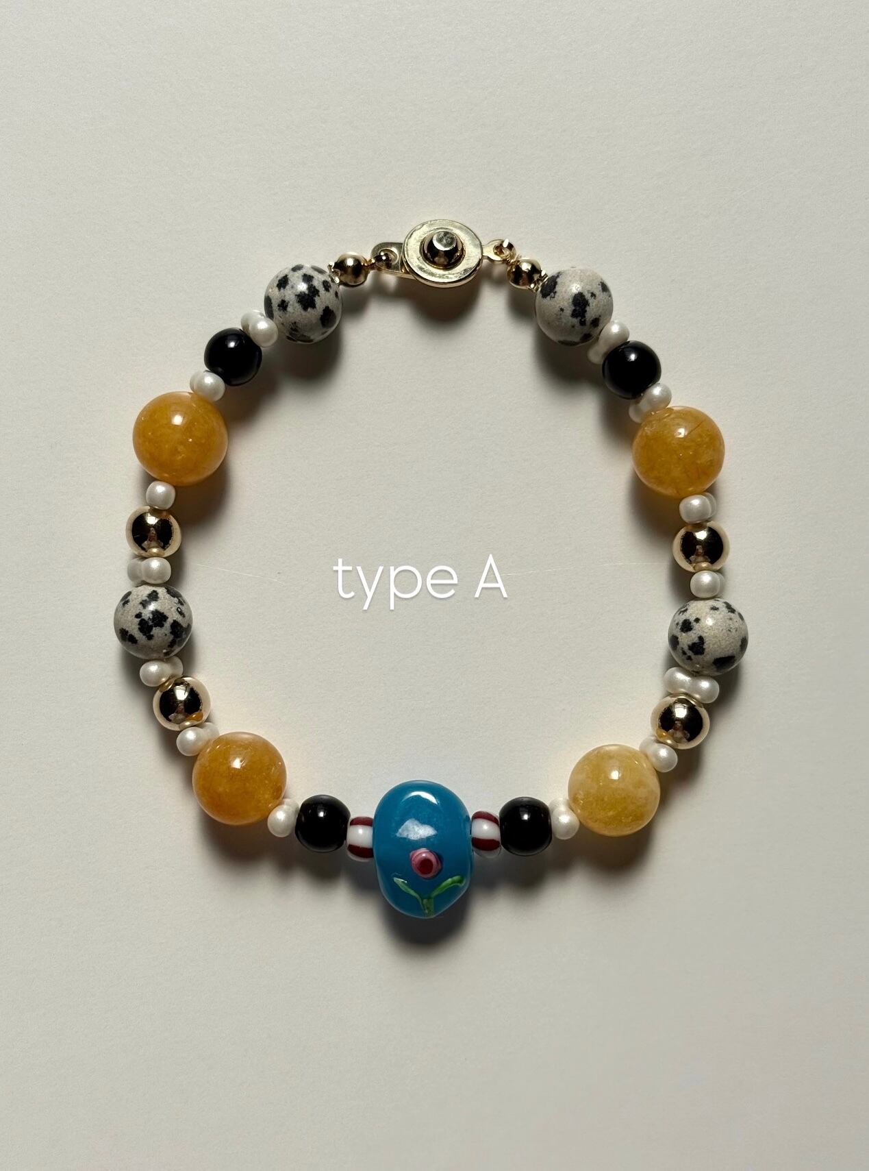 ちょこんと薔薇が施されたガラスビーズをポイントにさまざまな天然石やガラスビーズを組み合わせたブレスレットとなっております。