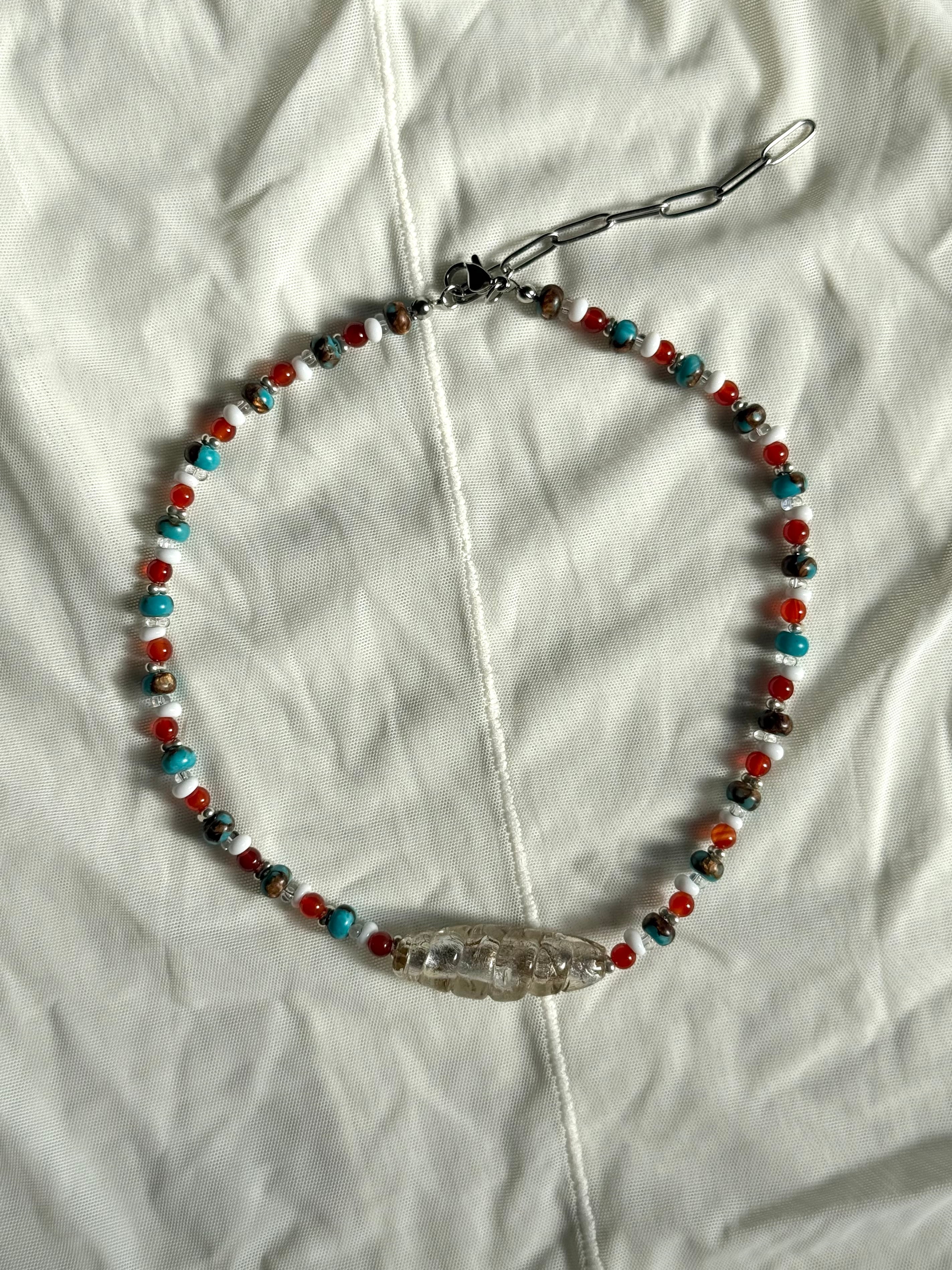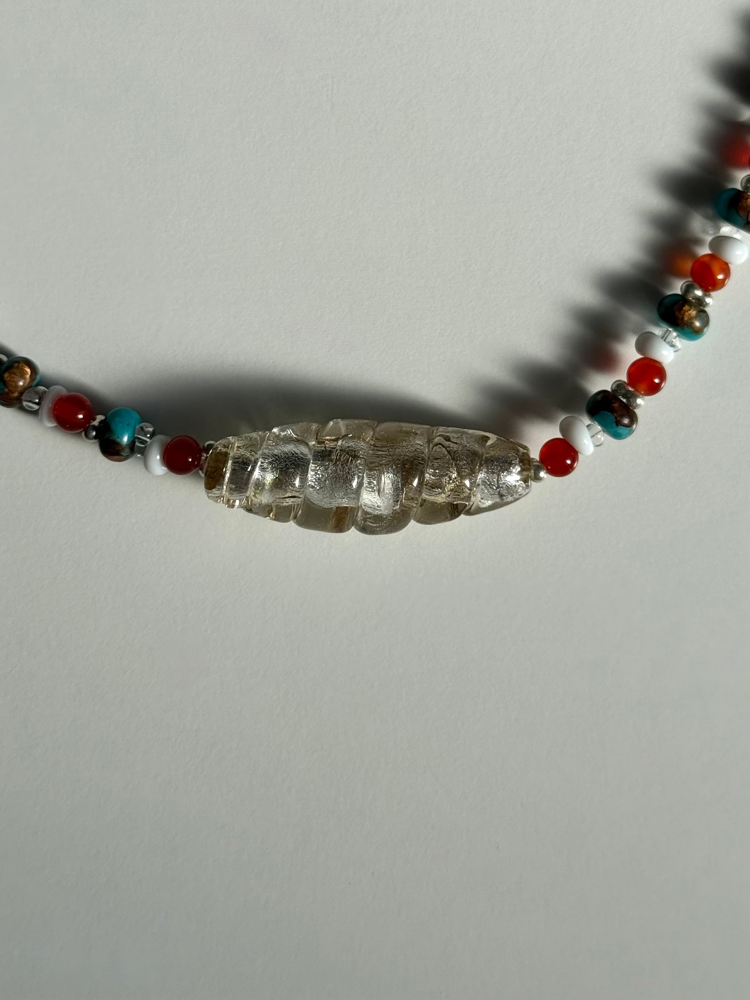 シルバーの白が中に施されたねじりガラスパーツをポイントにしたネックレスとなっております。