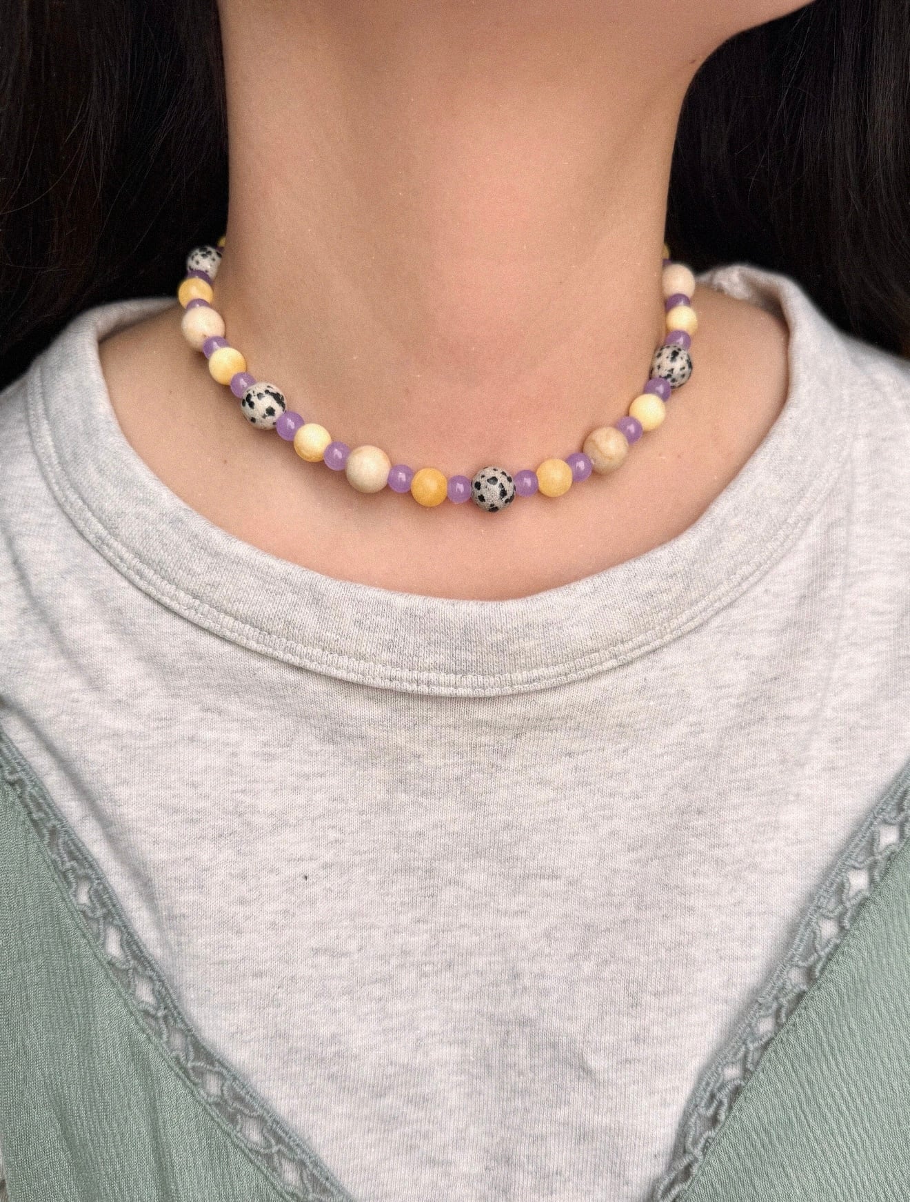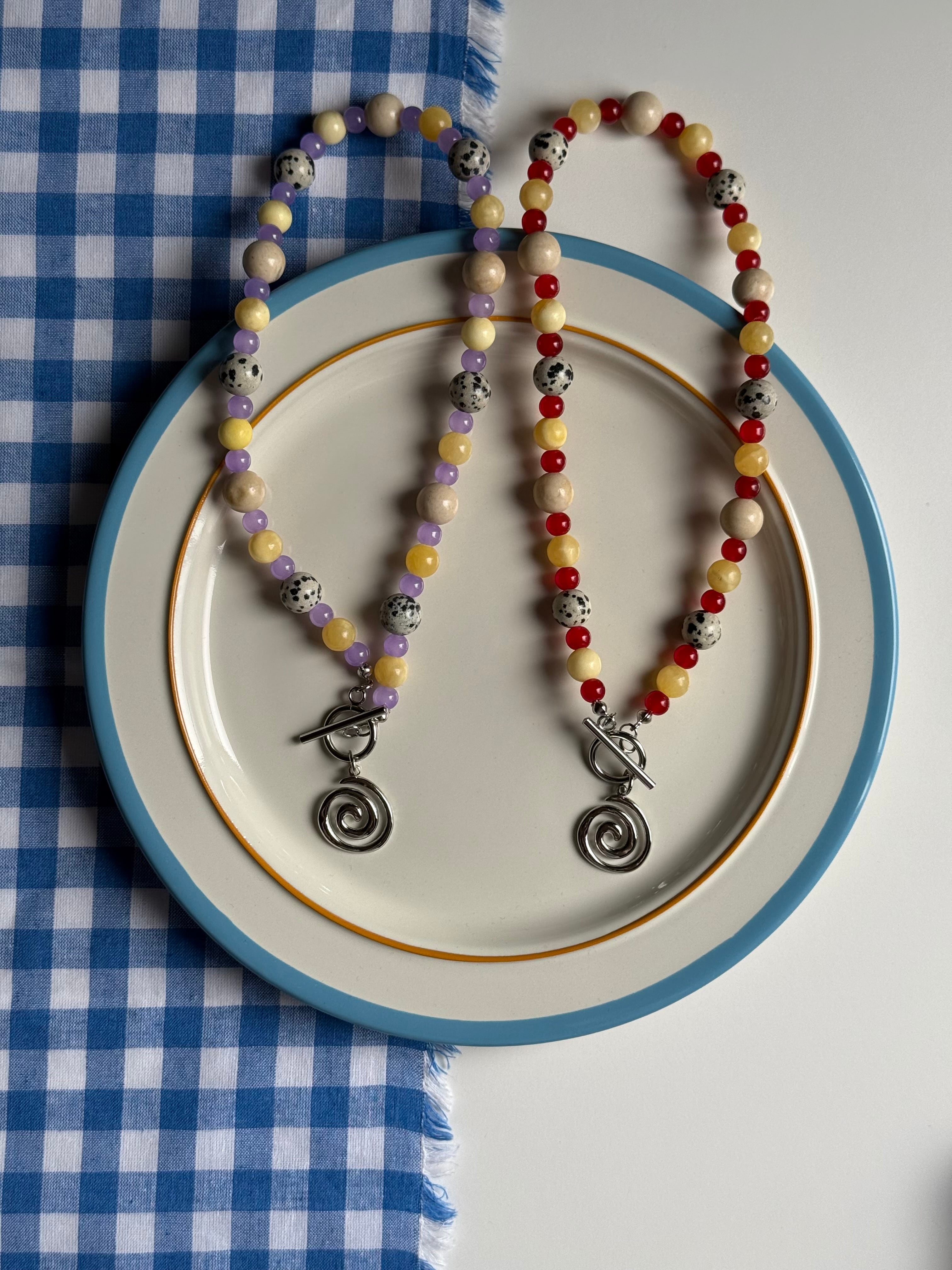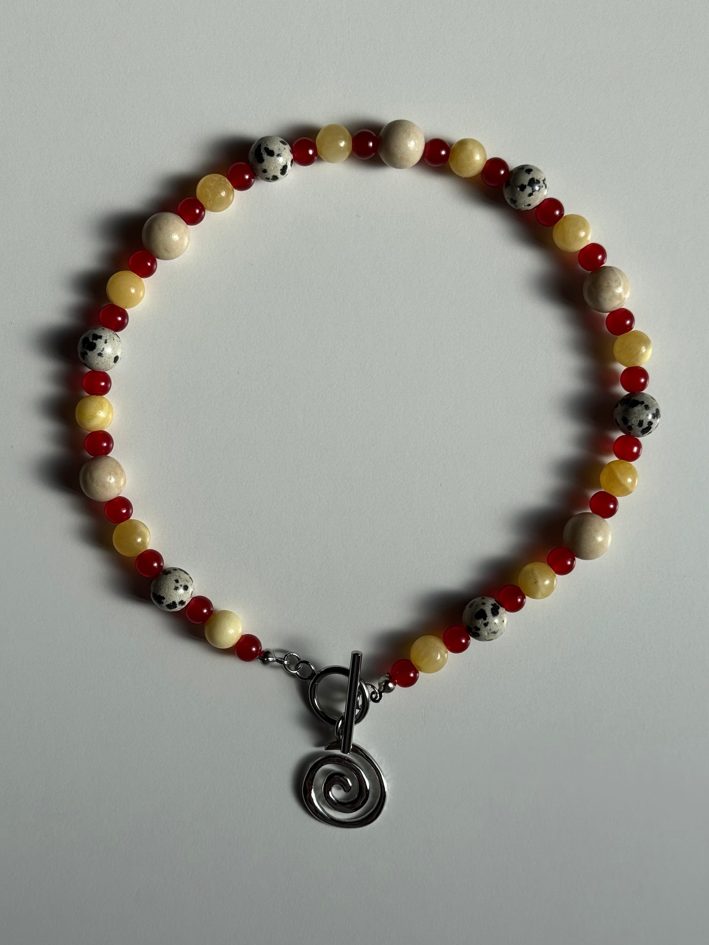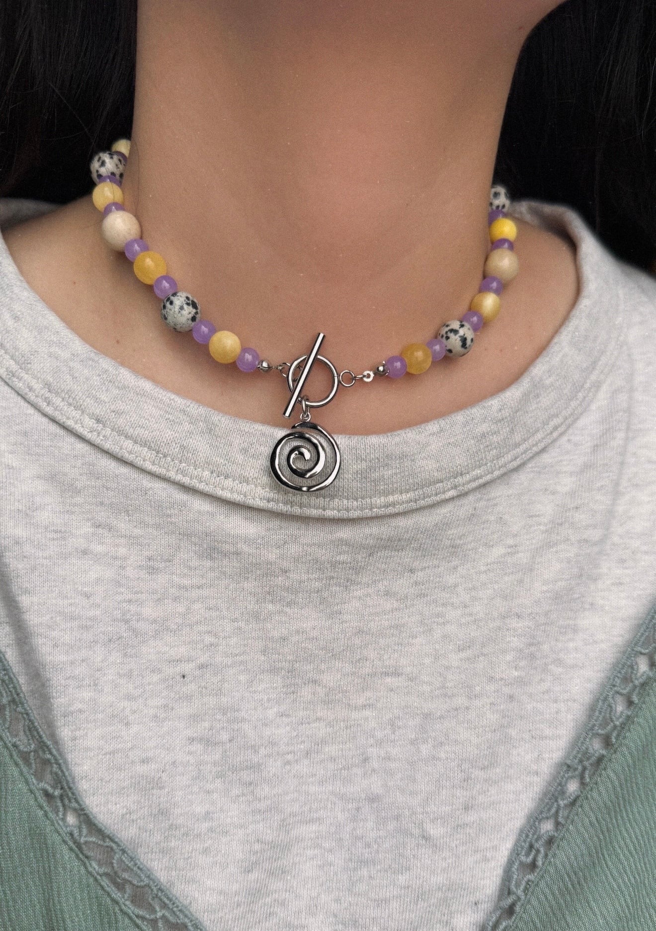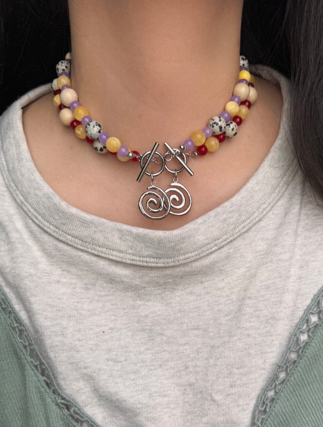 ぐるぐるチャームをポイントに天然石やガラスビーズを組み合わせたチョーカーとなっております。