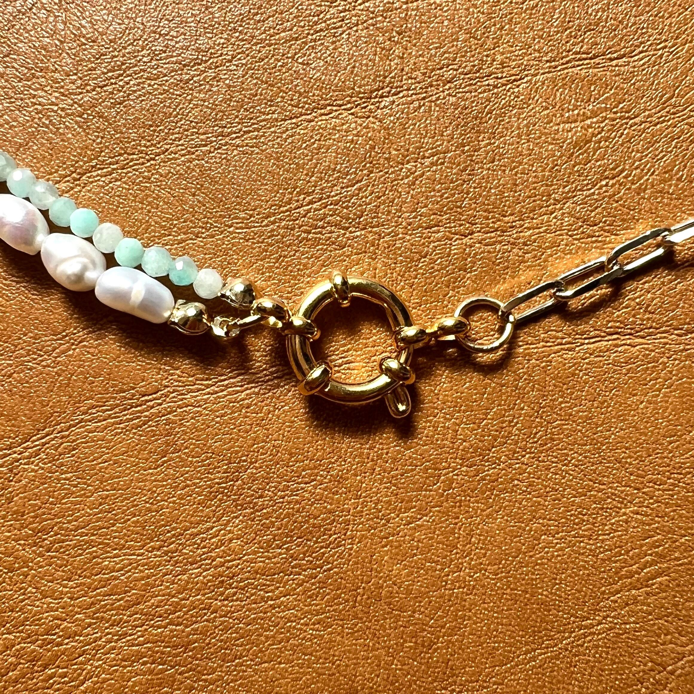 水色の小さな丸いシェルビーズとパールを組み合わせ、チェーンとアシンメトリーに仕上げたチョーカーとなっております。留め具部分をメインにして着けても可愛いデザインです。