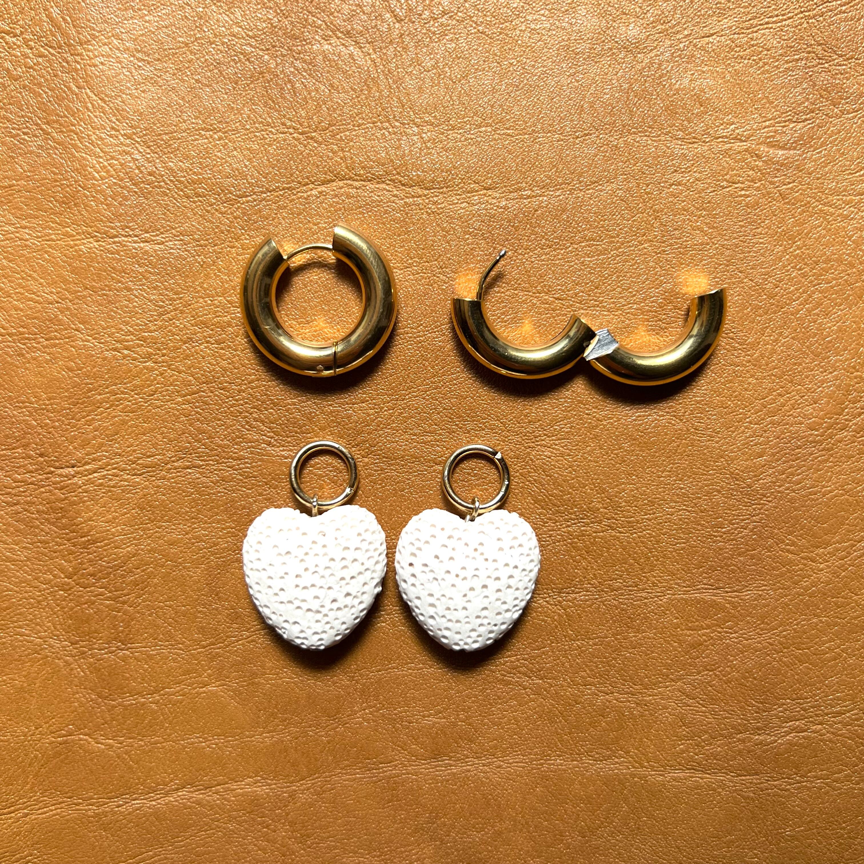 火山岩からできたハートチャームを大ぶりなフープピアスと組み合わせたピアスとなっております。