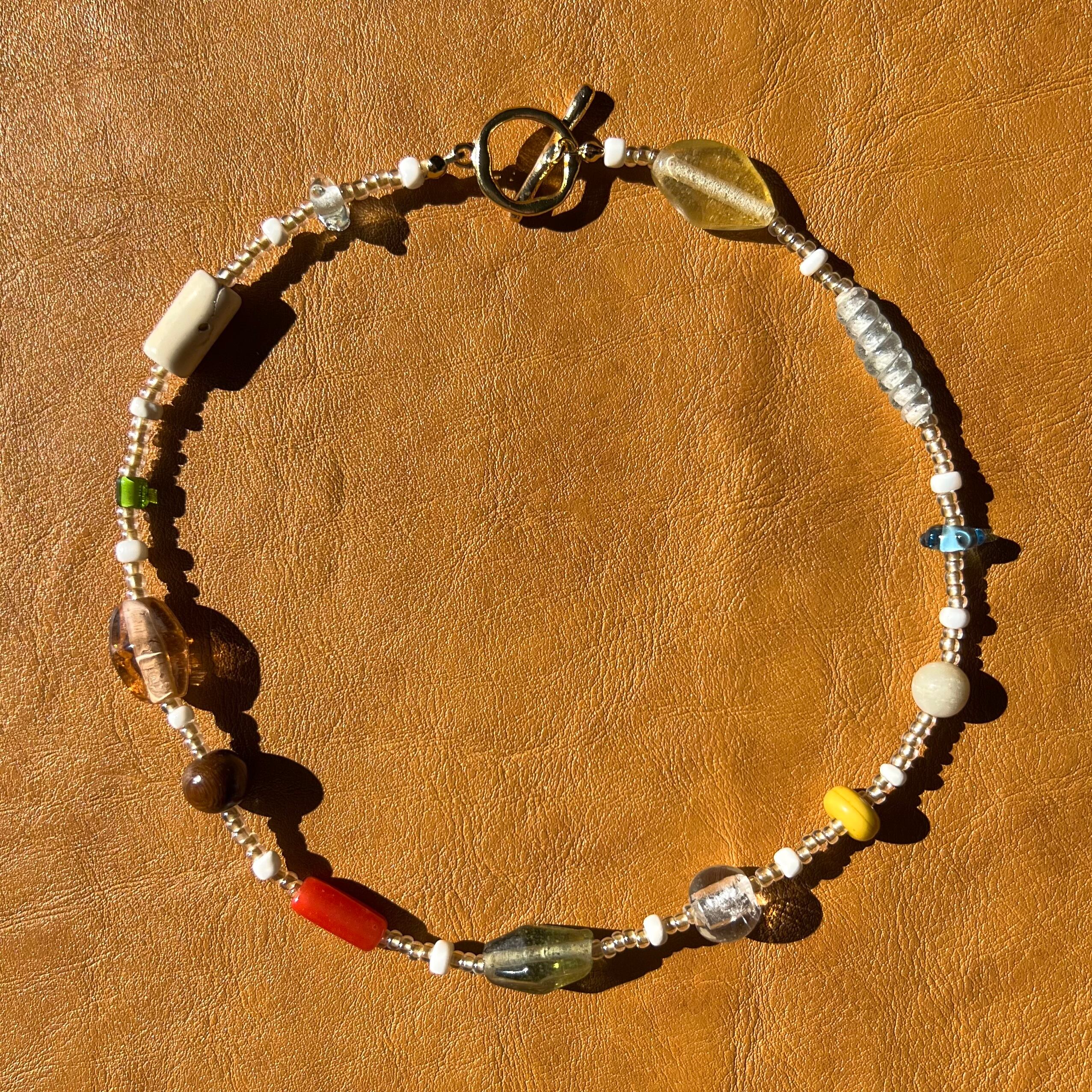 いろんな形のガラスビーズを組み合わせたネックレスとなっております。