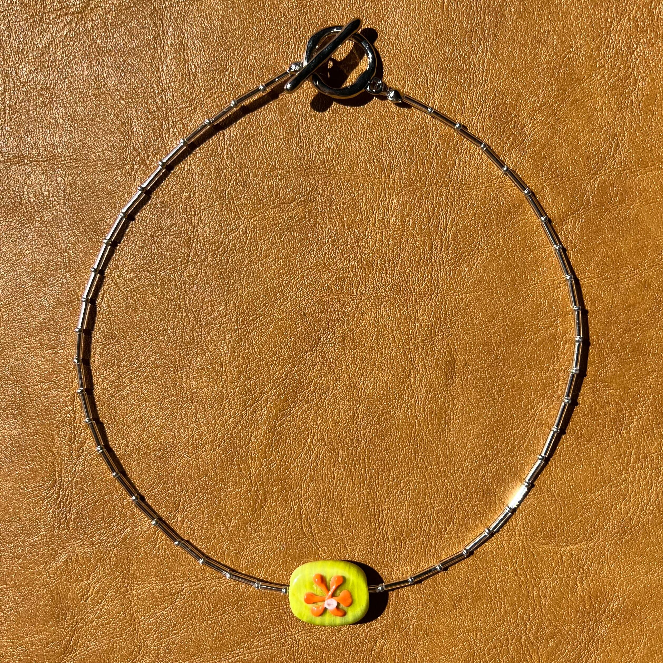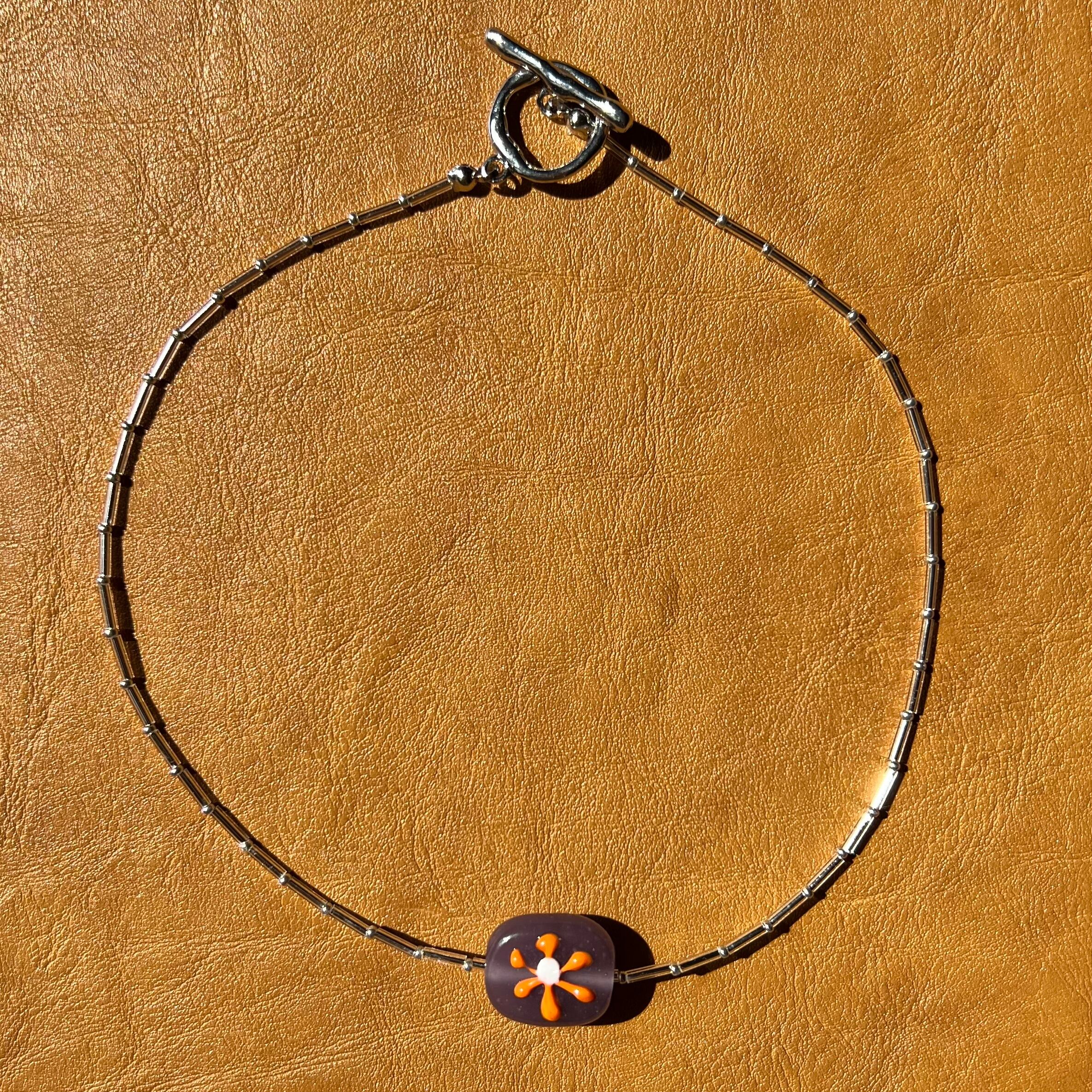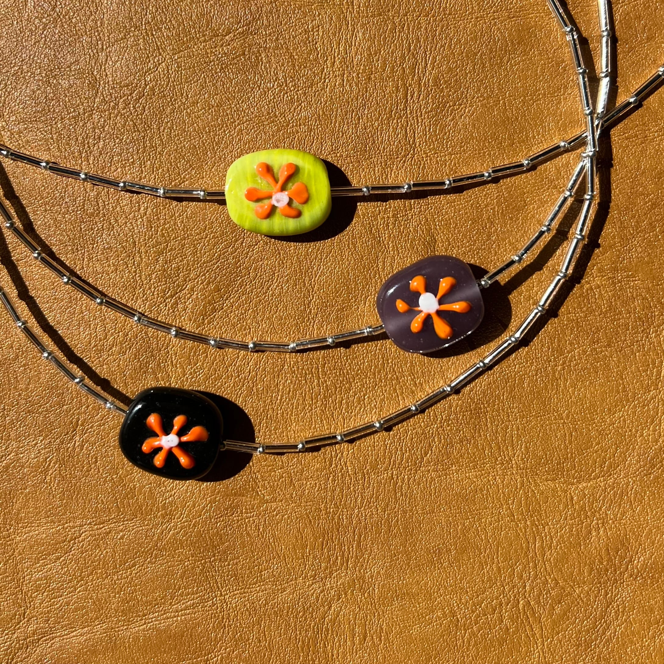 ガラスでできたお花の形のビーズをポイントに仕上げたチョーカーとなっております。