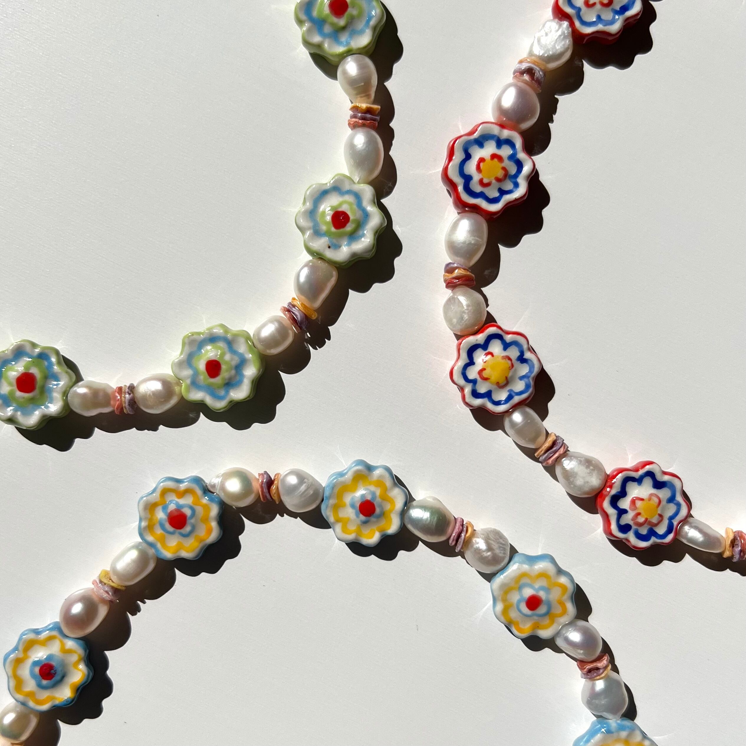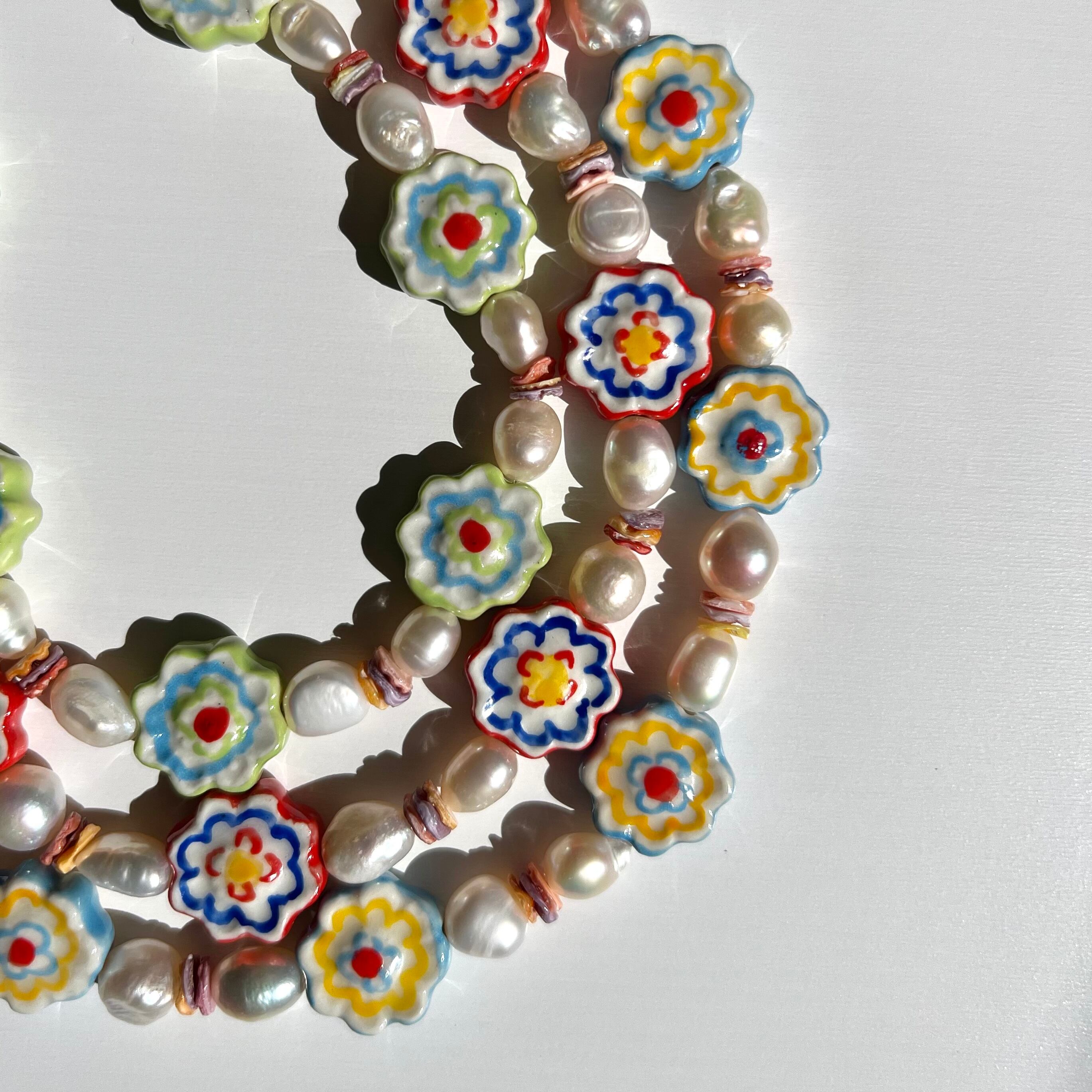陶器でできたお花のビーズが特徴的なネックレスとなっております。