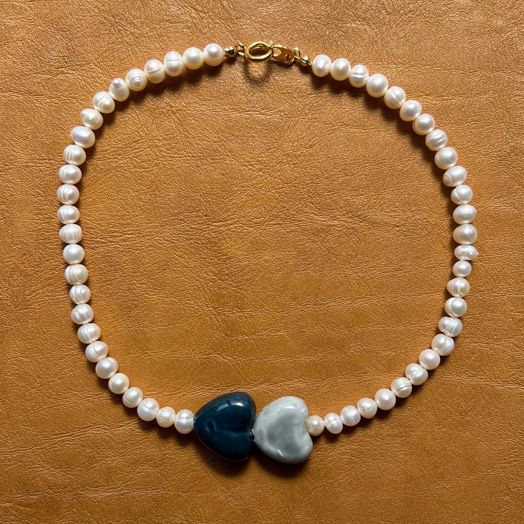 まん丸な淡水パールと陶器でできたハートを組み合わせたチョーカーとなっております。