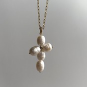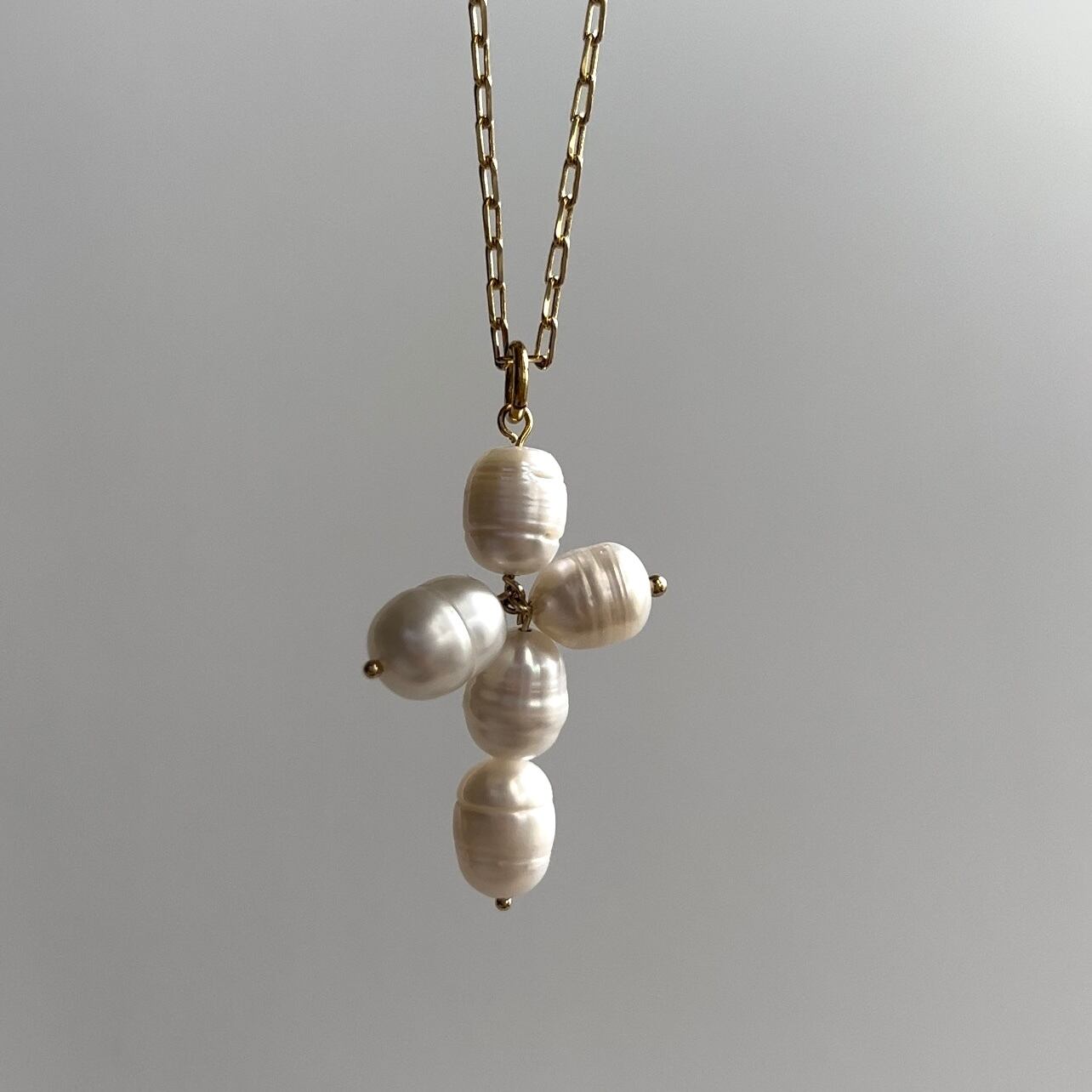 ゴールドチェーンと淡水パールで作られたクロスチャームを組み合わせたネックレスとなっております。
