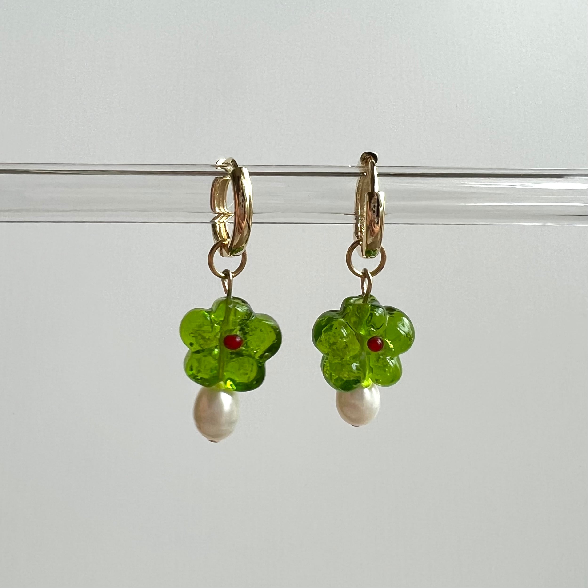 お花のガラスビーズと淡水パールを組み合わせたピアスとなっております。