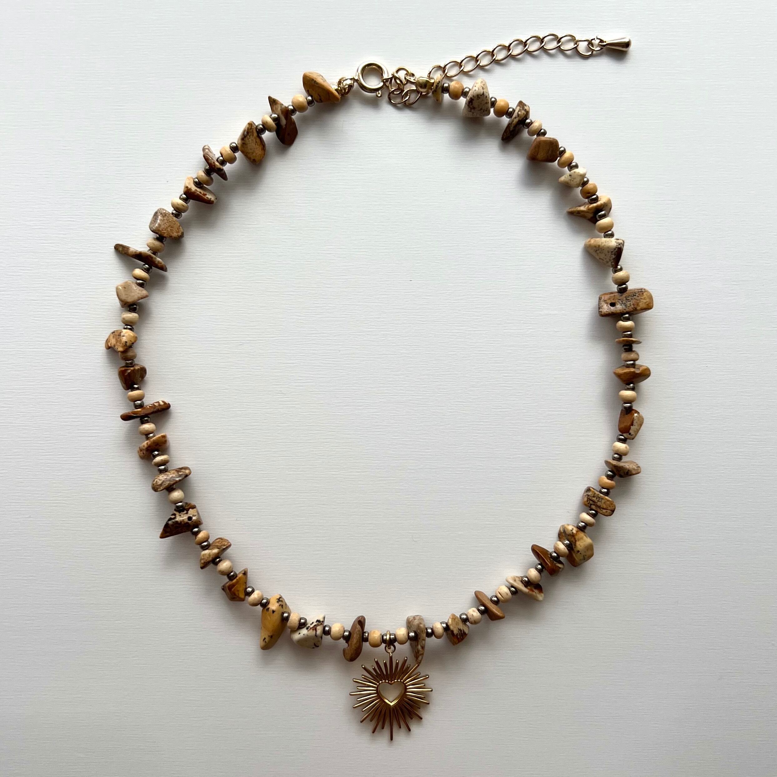 さまざまなビーズとハートチャームを組み合わせたチョーカーとなっております。