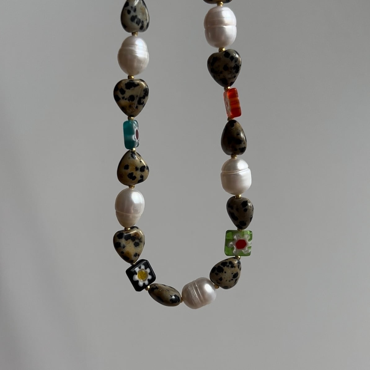 淡水パールにダルメシアン柄の天然石と色々な表情をもっているミレフィオリビーズのカラフルなアイテムです。