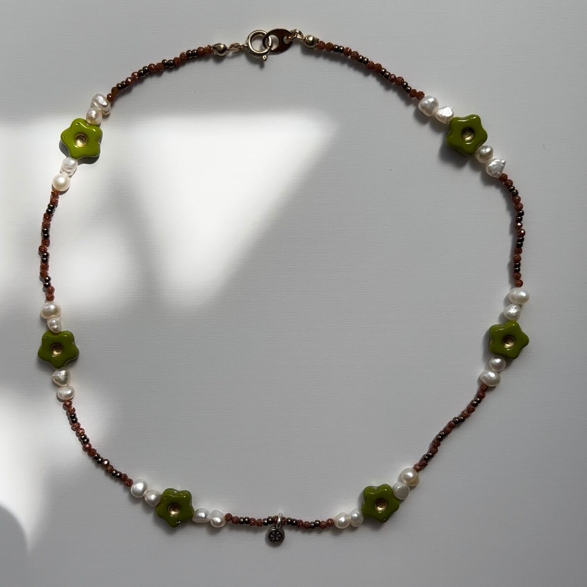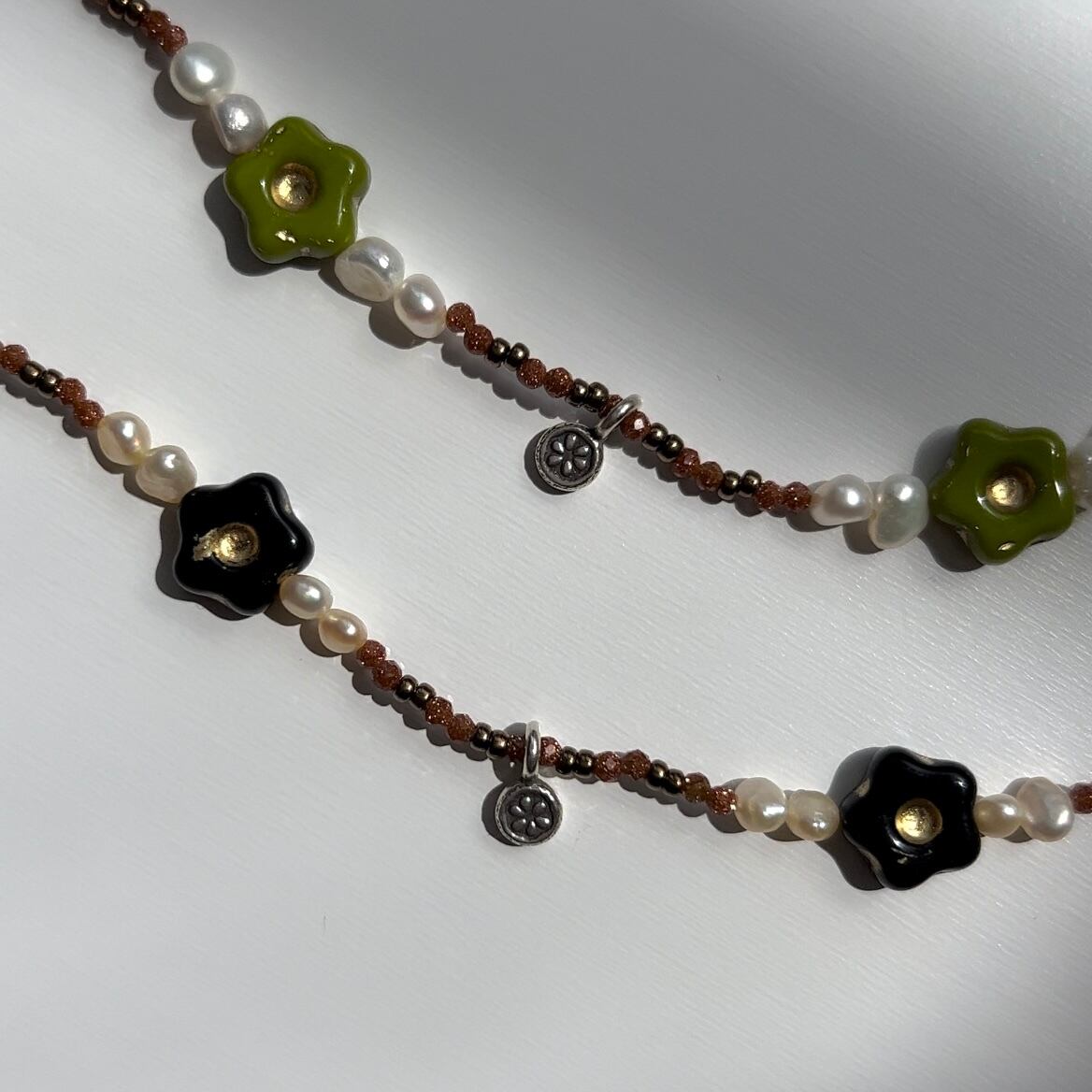 ちっちゃなビーズや淡水パールにポイントでそれぞれフラワービーズを掛け合わせたヴィンテージ風アイテムです。