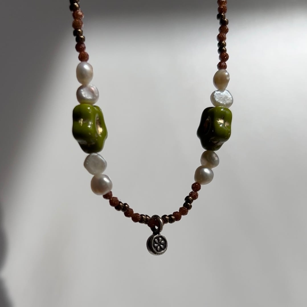 さまざまなビーズを組み合わせたネックレスとなっております。