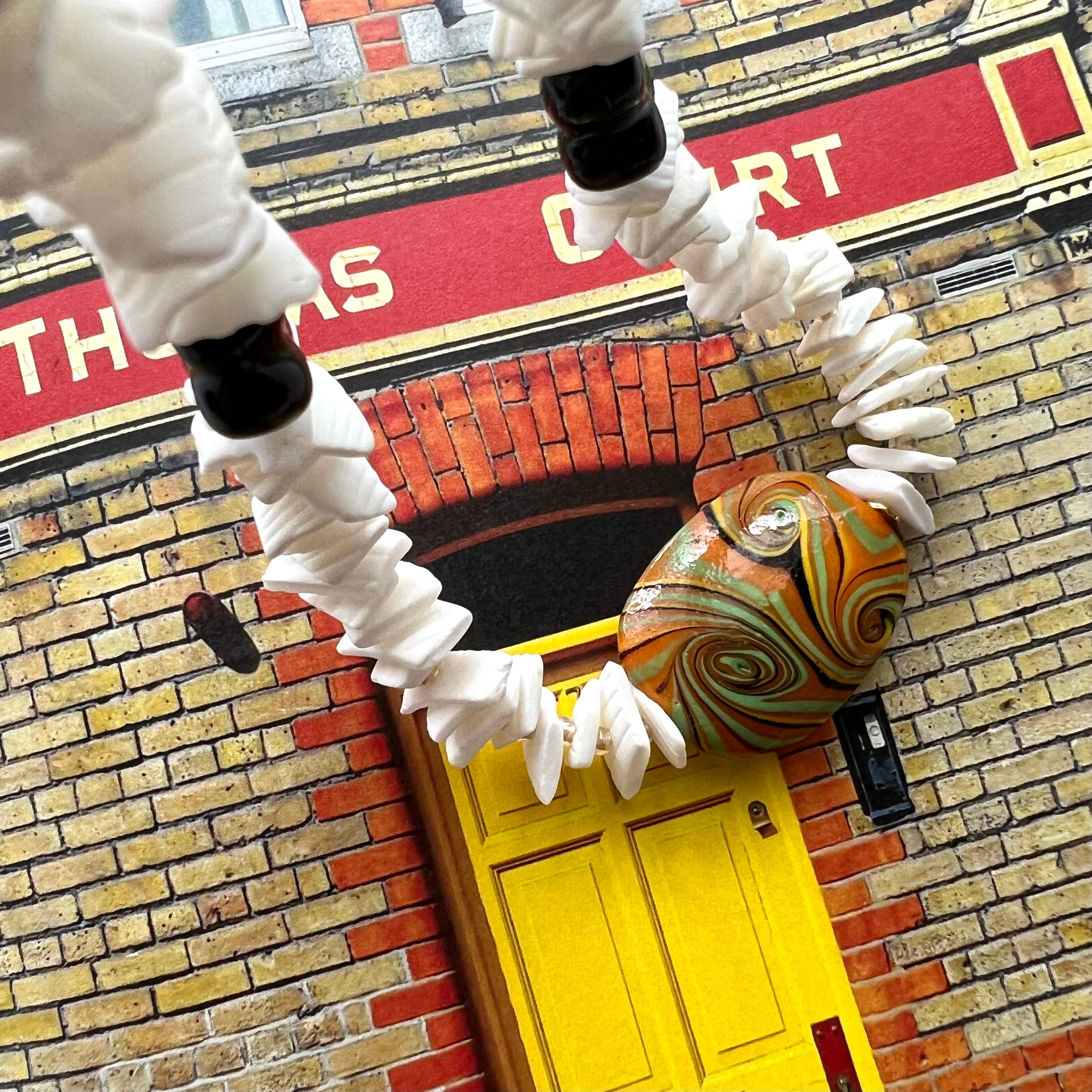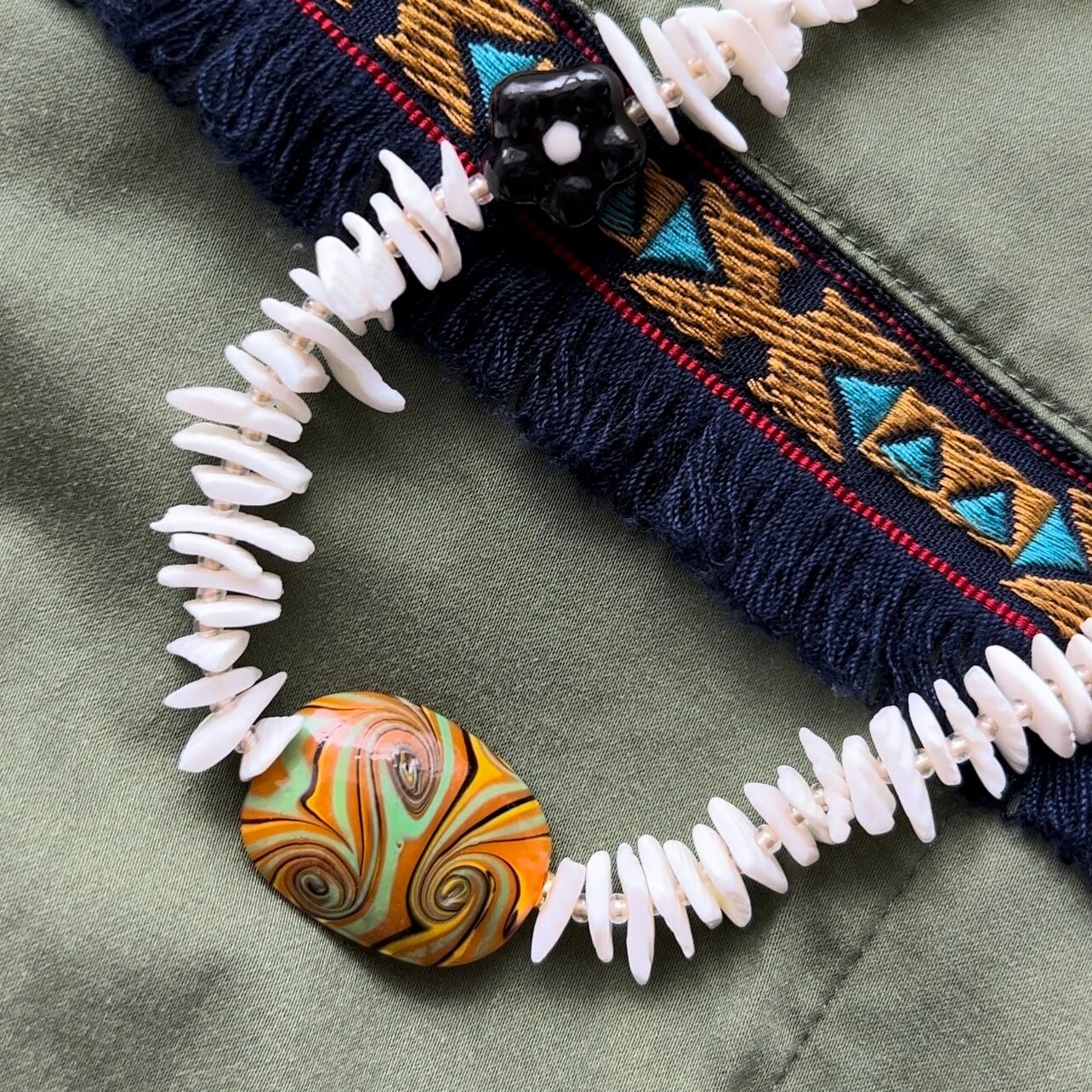 ガラスでできたグルグル柄のオーバルビーズがポイントのネックレスとなっております。