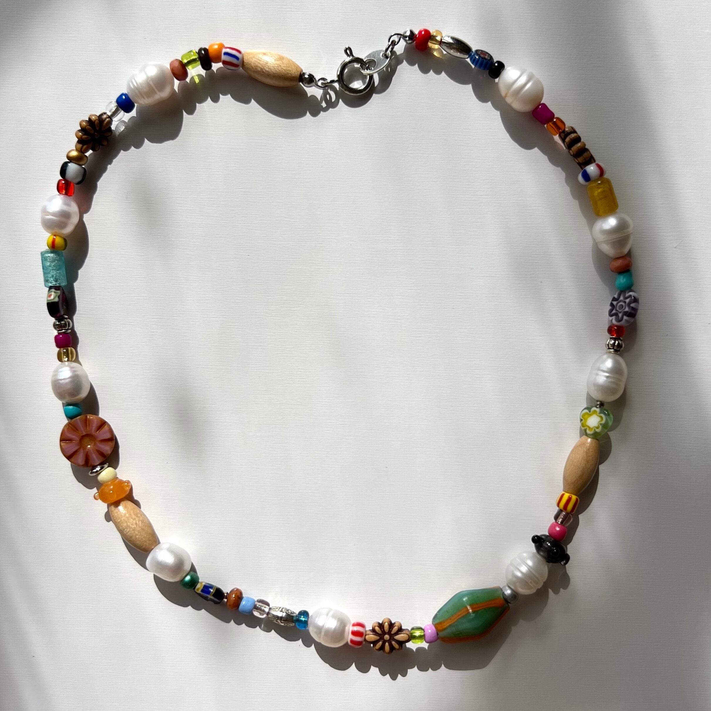 さまざまなビーズを組み合わせたネックレスとなっております。