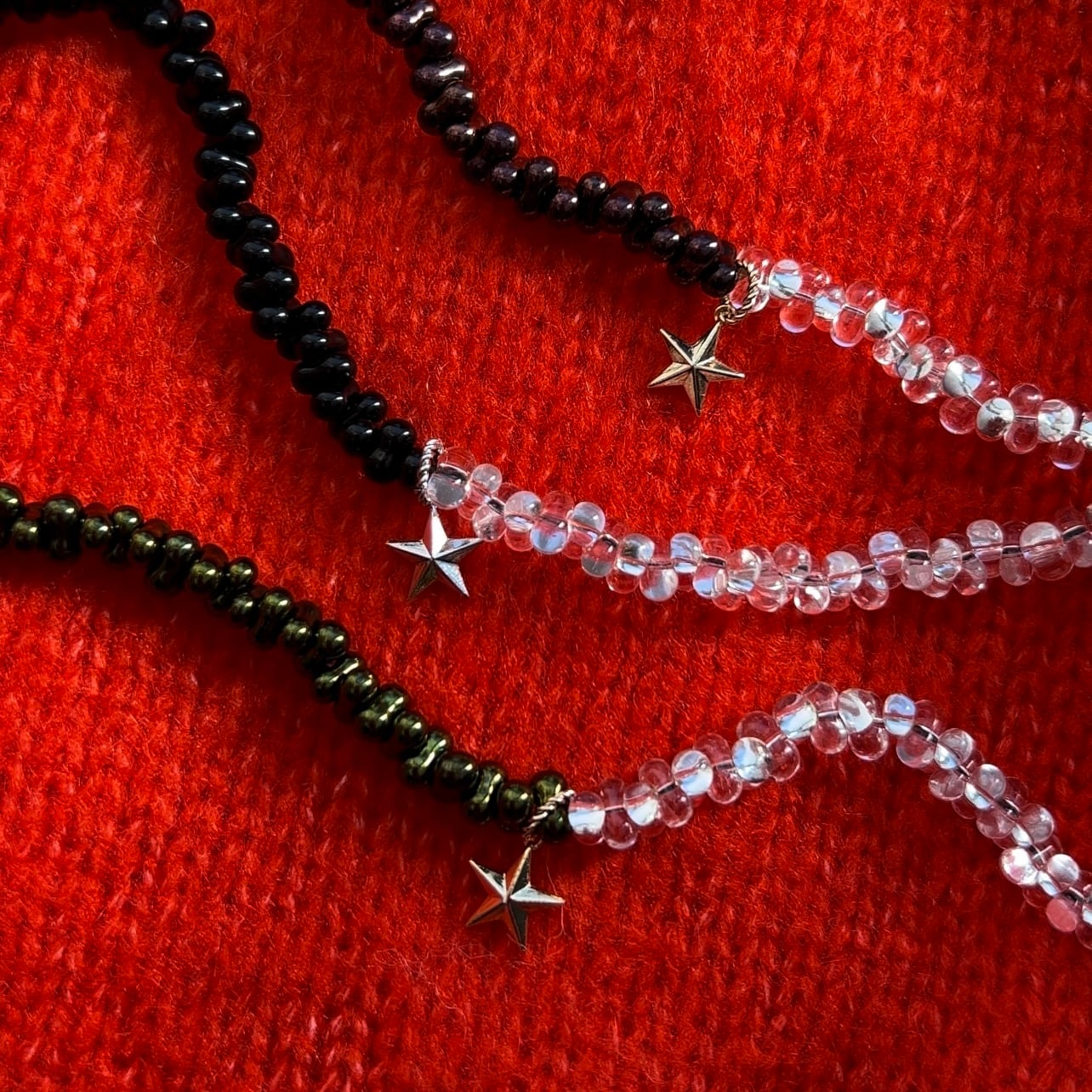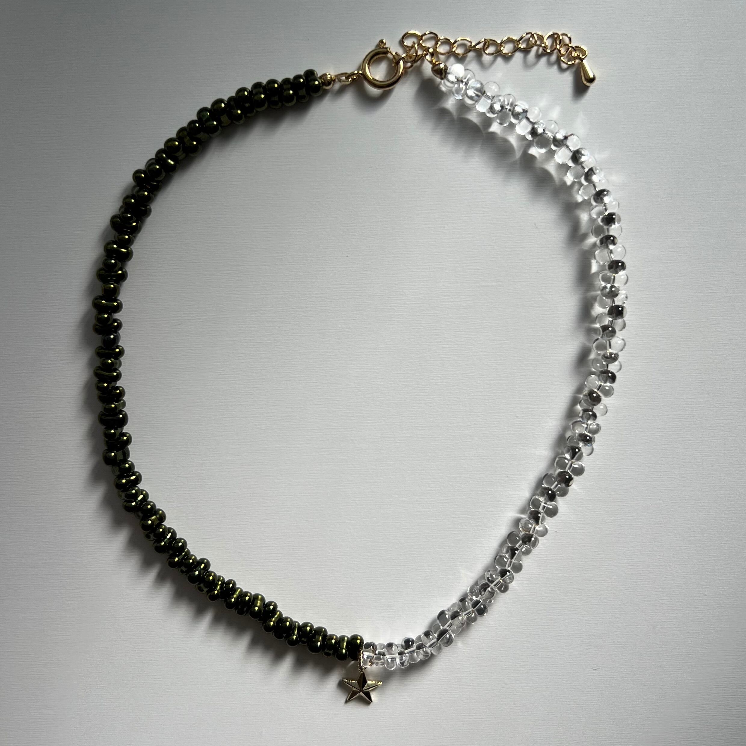ファルファーレビーズをちぐはぐに仕上げたネックレスとなっております。