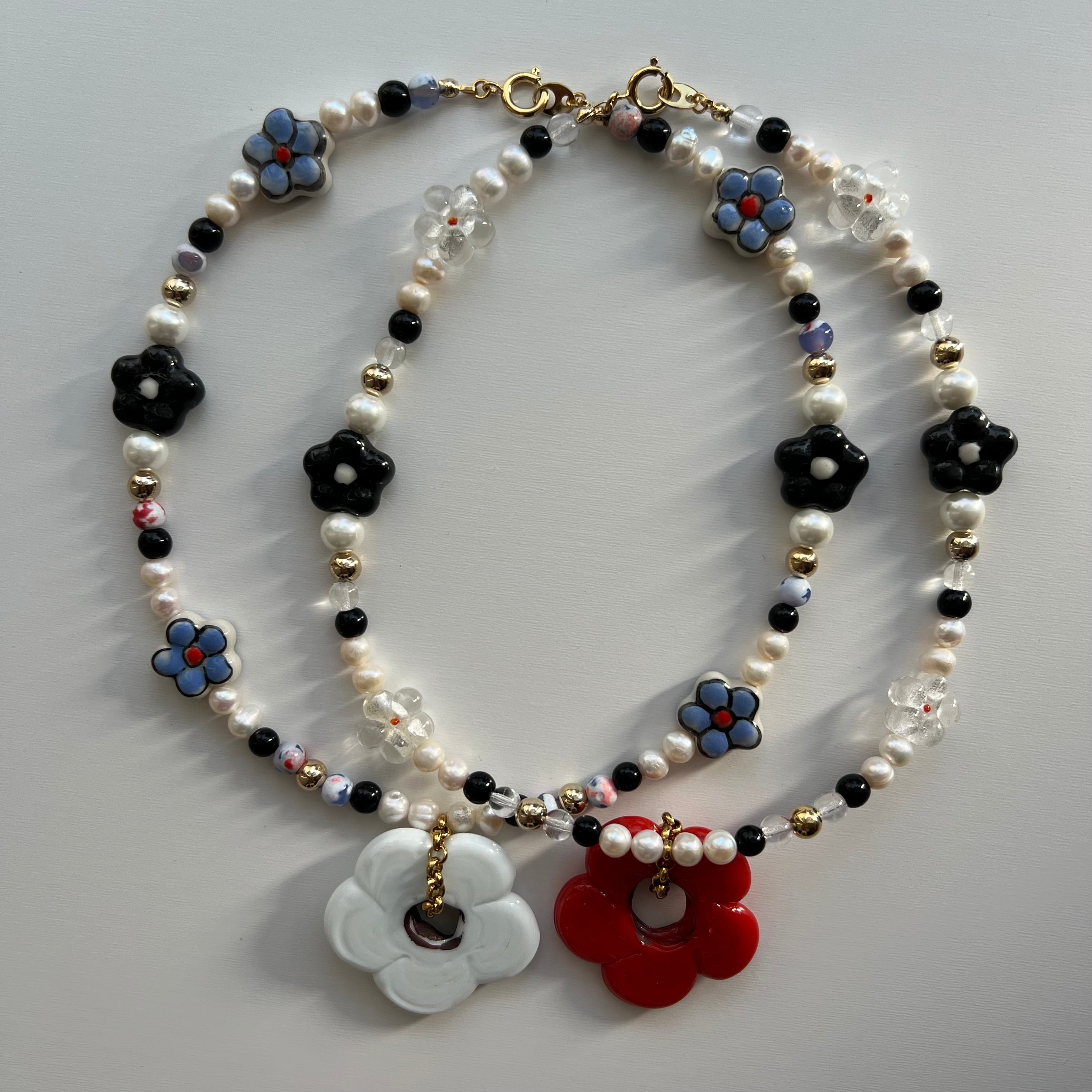 ガラスでできたお花のパーツをメインにそれぞれさまざまなビーズを組み合わせたネックレスとなっております。