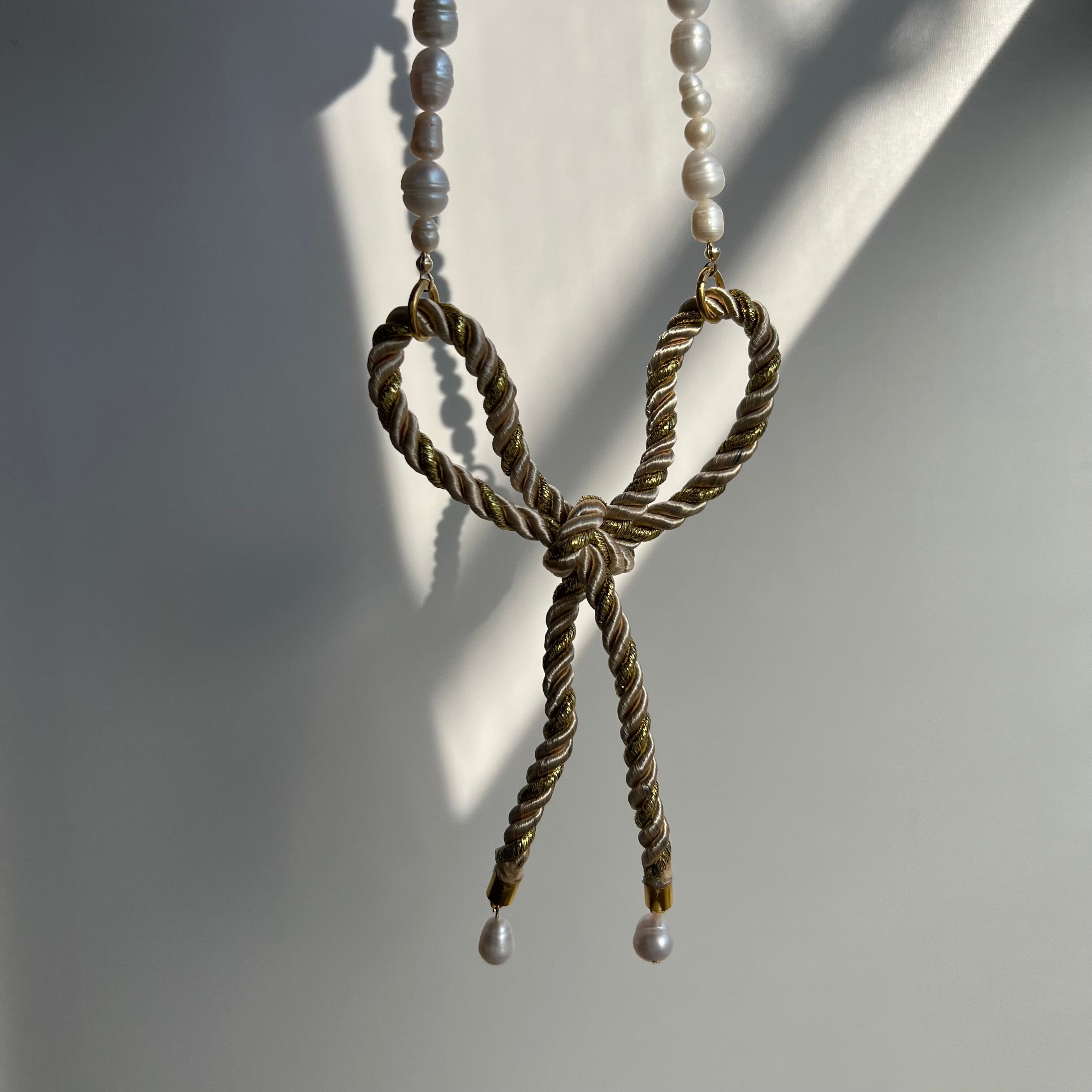 形の異なる淡水パールとリボンを組み合わせたネックレスとなっております。