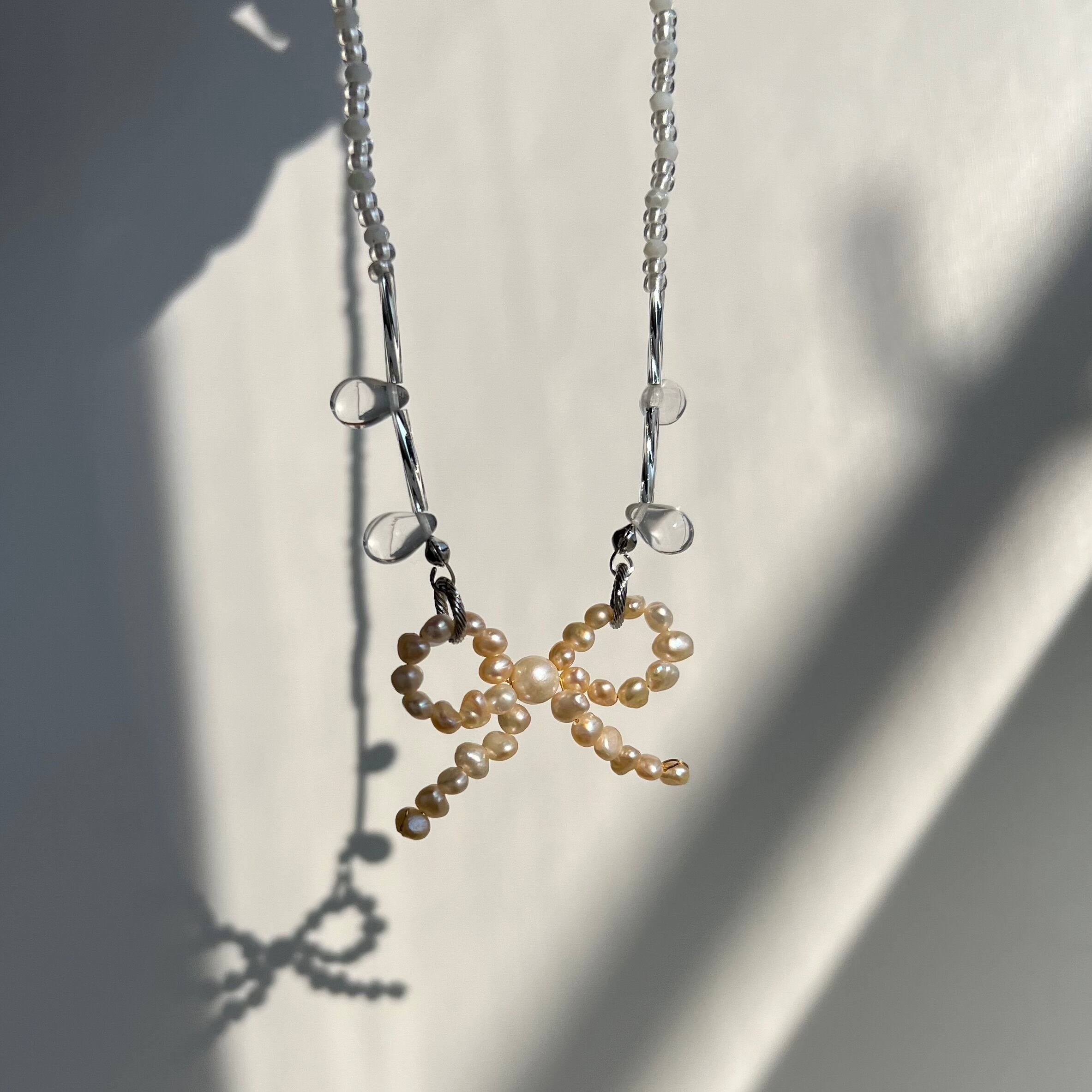 真ん中の淡水パールリボンが特徴的なネックレスとなっております。