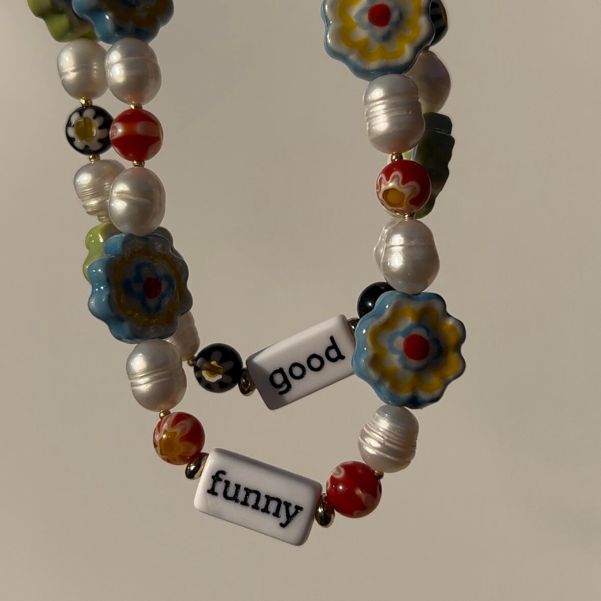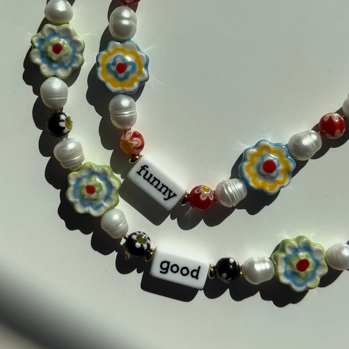陶器でできたビーズや淡水パールにミレフィオリビーズなどさまざまなビーズたちを組み合わせたので