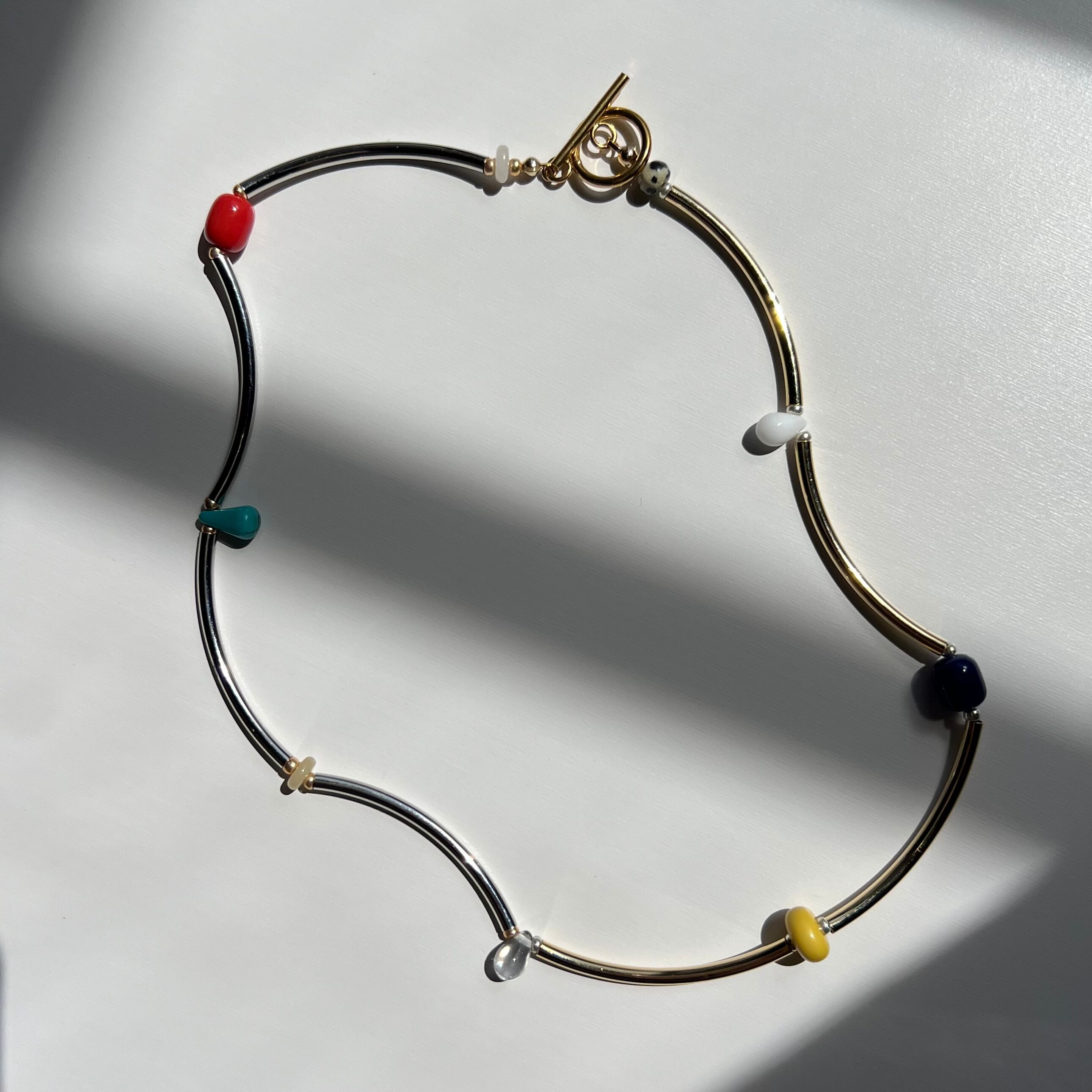 いろいろな表情のビーズを組み合わせたネックレスとなっております。
