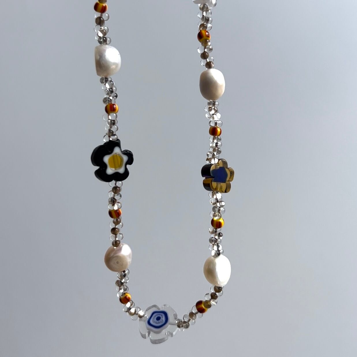 お花のビーズをポイントにさまざまなビーズを組み合わせたネックレスとなっております。