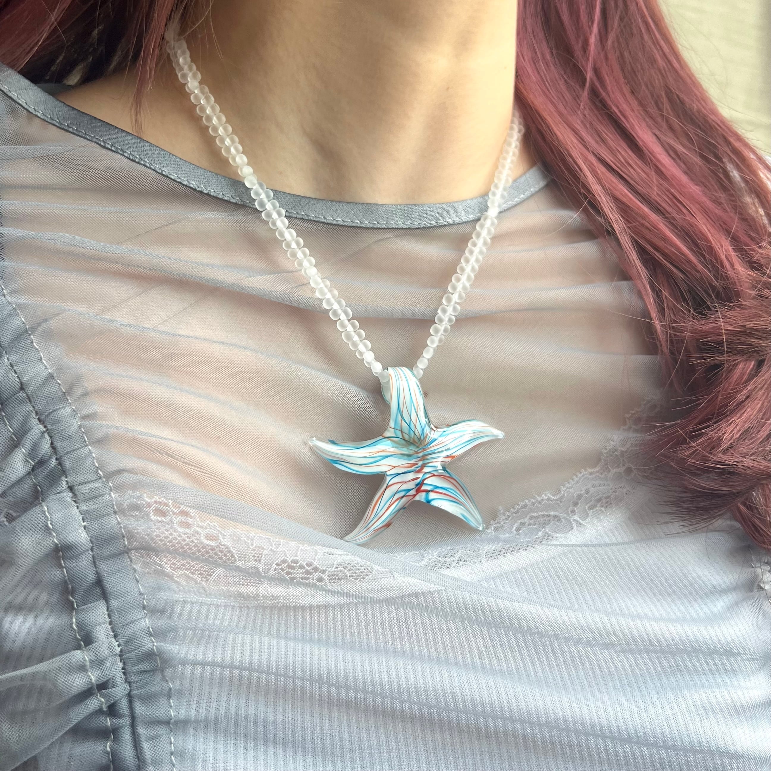 特殊な星の形のガラスチャームがポイントのネックレスとなっております。