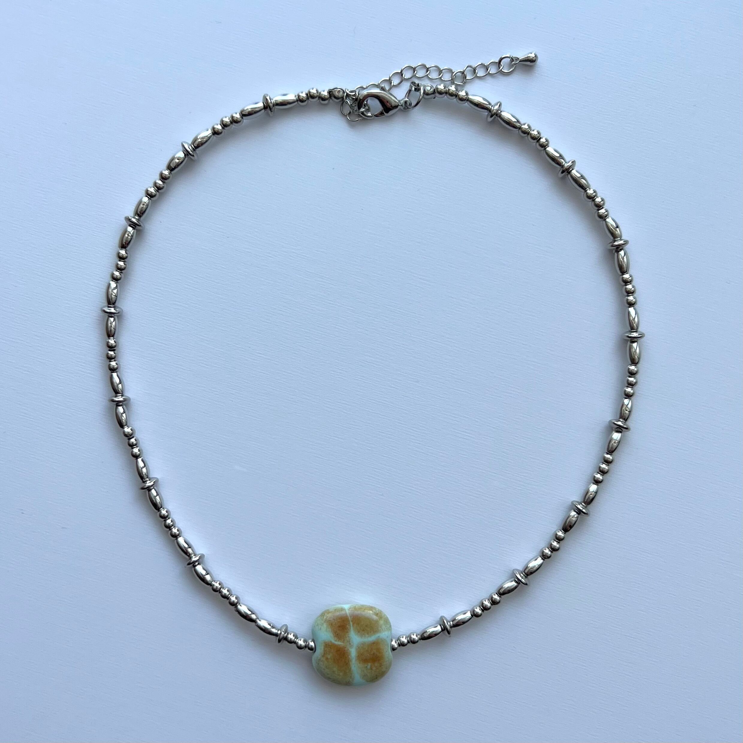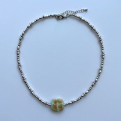 特殊な模様のガラスビーズとシルバービーズを組み合わせたネックレスとなっております。